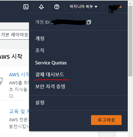 위 주소에서 본인 계정 로그인 하여, 우 상단 본인 아이디 클릭하여 보이는 메뉴(아래 그림) 중 결제 대시보드 클릭