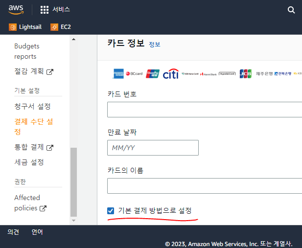 추가할 카드 정보 기록하고, 기본 결제 방법으로 설정 체크 하여 이후 신규 추가한 카드로 결제 되게 한다.