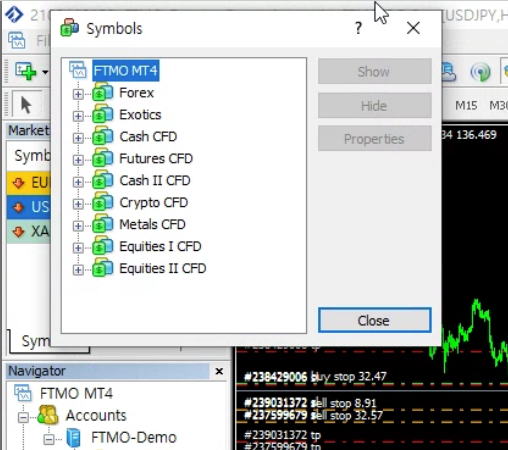 FTMO 메타트레이더4 실행시켜서 Symbols 창을 열어 보면 FTMO 에서 거래 가능한 모든 종목을 모두 볼 수 있다.