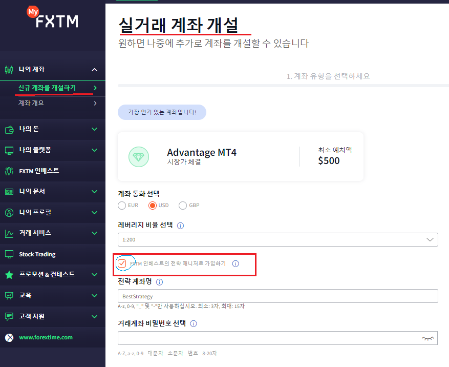 - FXTM 가입 후 신규 계좌 개설하는 단계(아래화면)에서 계좌 종류 Advange 또는 Advantage Plus 선택하고 MT4 선택하여 "FXTM 인베스트의 전략 매니저로 가입하기" 선택한 상태로 계좌 개설해야 , 이 계좌로 전략매니저로 활동 가능한 상태가 된다. (MT4 선택해야 전략 매니저로 활동 가능하며, MT5 는 전략 매니저로 가입 안됨)