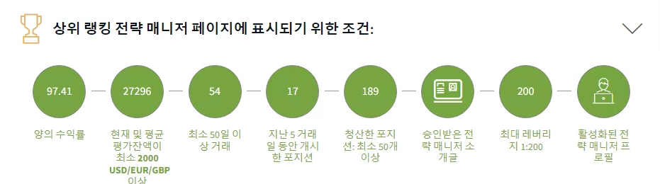본인 자금 최소 2,000달러 이상, 수익률이 손실이 아니면 되고, 거래일 수가 50일 이상(거래한 일수를 의미함 거래 없이 하루가 지나갔다면 거래일수로 포함시키지 않음) 이면 상위 전략 매니저 리스트에는 보인다.