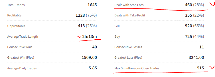 위 거래 요약 데이터의 오른쪽 위의 Deals with Stop Loss 라는 값은 진입 주문 함과 동시에 손절 주문 같이 낸 수량을 보여주는데 전체 주문 중 28% 에만 손절 주문 했음을 알 수 있다. 손절 에 별 관심없는 매매 전략임을 증명하는 것.
