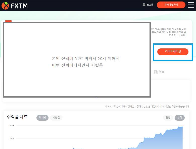 - 상위 전략매니저 중에 마음에 드는 것 골라서 해당 전략 매니저 페이지에서 카피트레이딩 (아래 그림 파란 박스) 버튼 클릭하면 본인 계정에 해당 전략매니저 전용의 투자 전용계좌가 만들어지며, 이 계좌로 투자할 금액을 입금해두면 이후는 해당 전략매니저와 동일 매매가 이뤄진다.