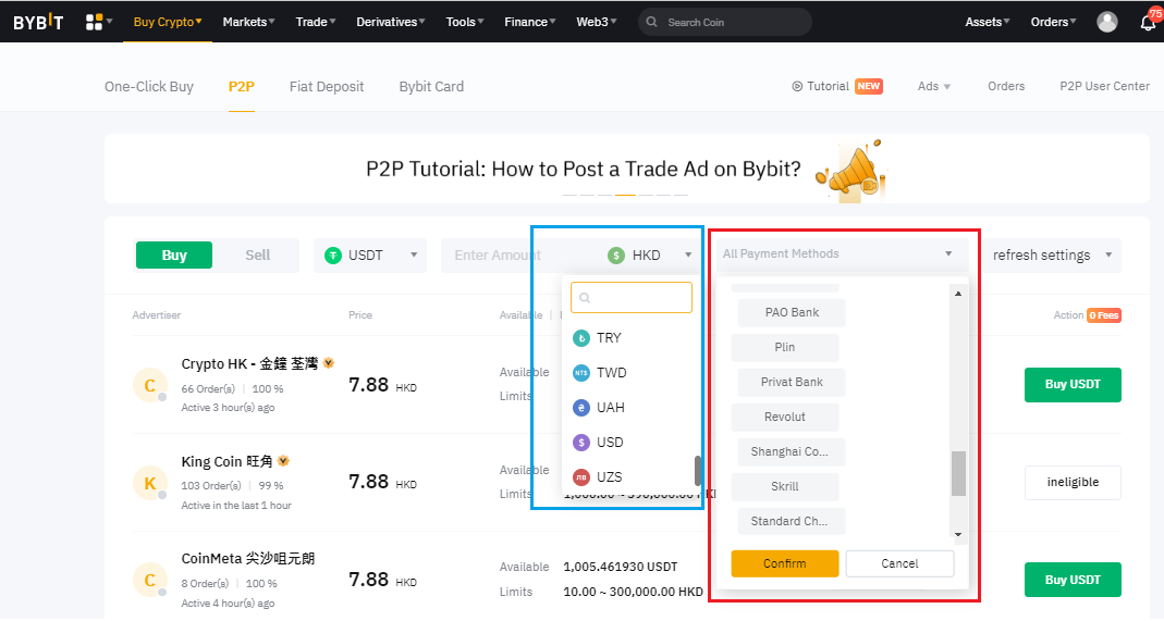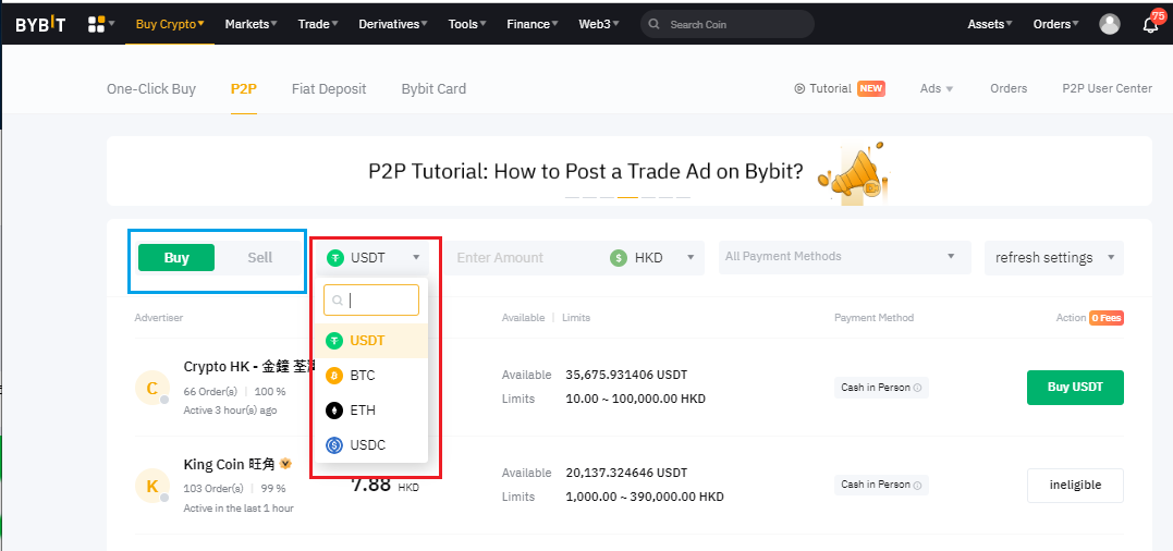 P2P 거래 화면(아래그림) 에서 파란색 박스 부분은 암호화폐 구입하려는 경우 Buy , 판매 하려는 경우 Sell 클릭한다. 붉은 색 박스 부분은 P2P 로 거래 가능한 암호화폐 4종(USDT, BTC, ETH, USDC)이 보인다. 거래 하려는 암호화폐를 선택한다.
