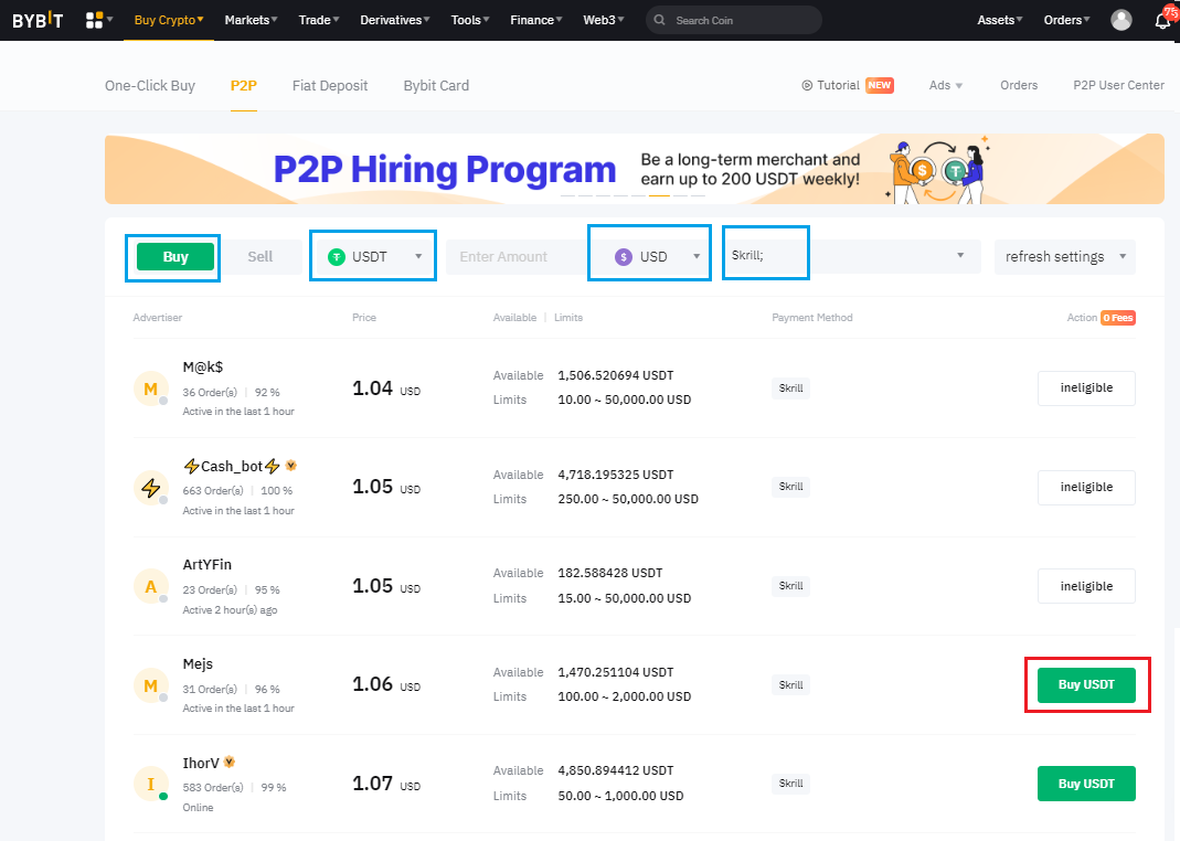 - 본 글에서는 BYBIT 에서 본인 Skrill 을 결제수단으로 암호화폐 구입 방법 정리.