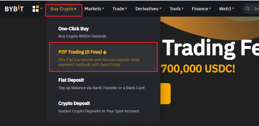 바이비트 웹사이트에서 상단 메뉴 Buy Crypto 클릭하여 보이는 P2P Trading 클릭 (아래 그림).