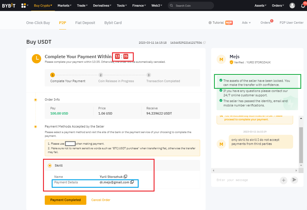 상기 화면 오른쪽은 판매자와 챗팅 가능한 창 이며, 초록색 박스 부분을 보면 현재 판매자가 바이빗 거래소 지갑에 보유한 USDT 중에 내가 주문 하려고 하는 94.339622 USDT 는 판매자의 바이빗 지갑에서 동결 상태로 되어 판매자가 임의로 인출 못하며 구매한 사람에게 송금 하도록 바이빗이 강제 조치 해둔다. 내가 Skrill 로 USD 를 판매자에게 이체 했음에도 판매자가 보유한 암호화폐를 나에게 송금하지 않고 사기치는 것을 방지하는 역할을 바이빗이 해주고 있음.