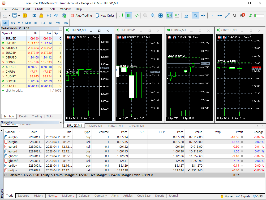 GBPCHF 0.1 랏(= 10,000 GBP) 를 환율 1.12611 에서 매도 했기 때문에 CHF 매수량은 11261.1 ( = 10,000 * 1.12611)