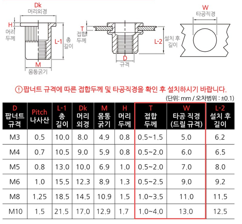 - 팝너트 제품사양 보면 M3, M10 등으로 지칭하는데 이것은 아래 도면의 D 이며 팝너트에 체결 가능한 볼트의 지름을 의미한다.