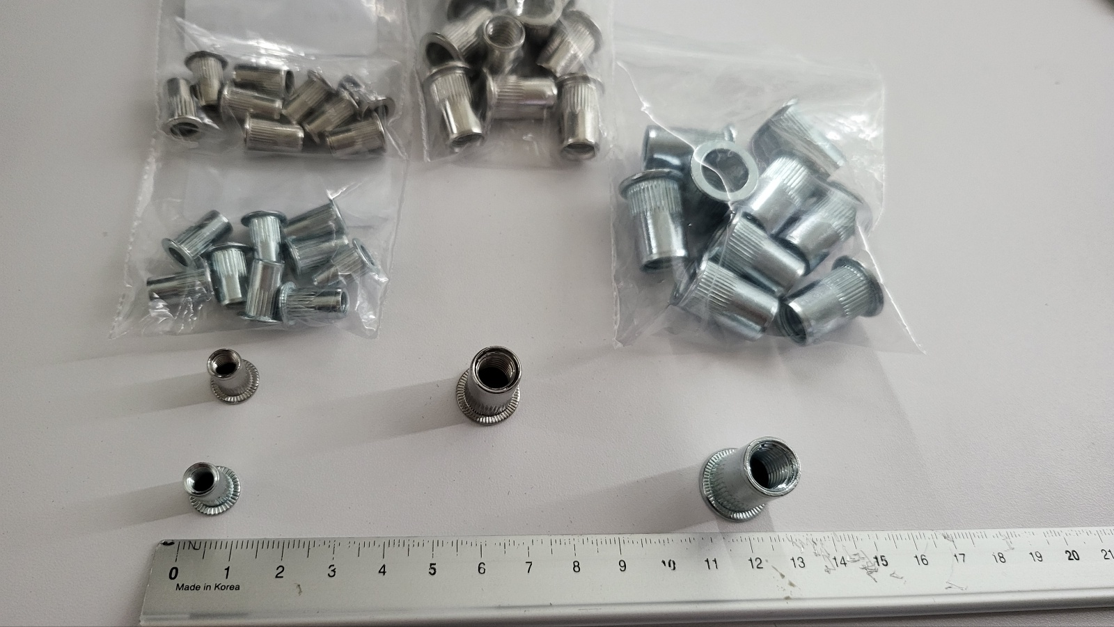 - 앞의 판매처 2 에서 철제 , 스텐 넓은 머리 타입 팝너트 구입. 아래 사진에서 푸른색을 띠는 것는 철제, 은색으로 보이는 것이 스텐,