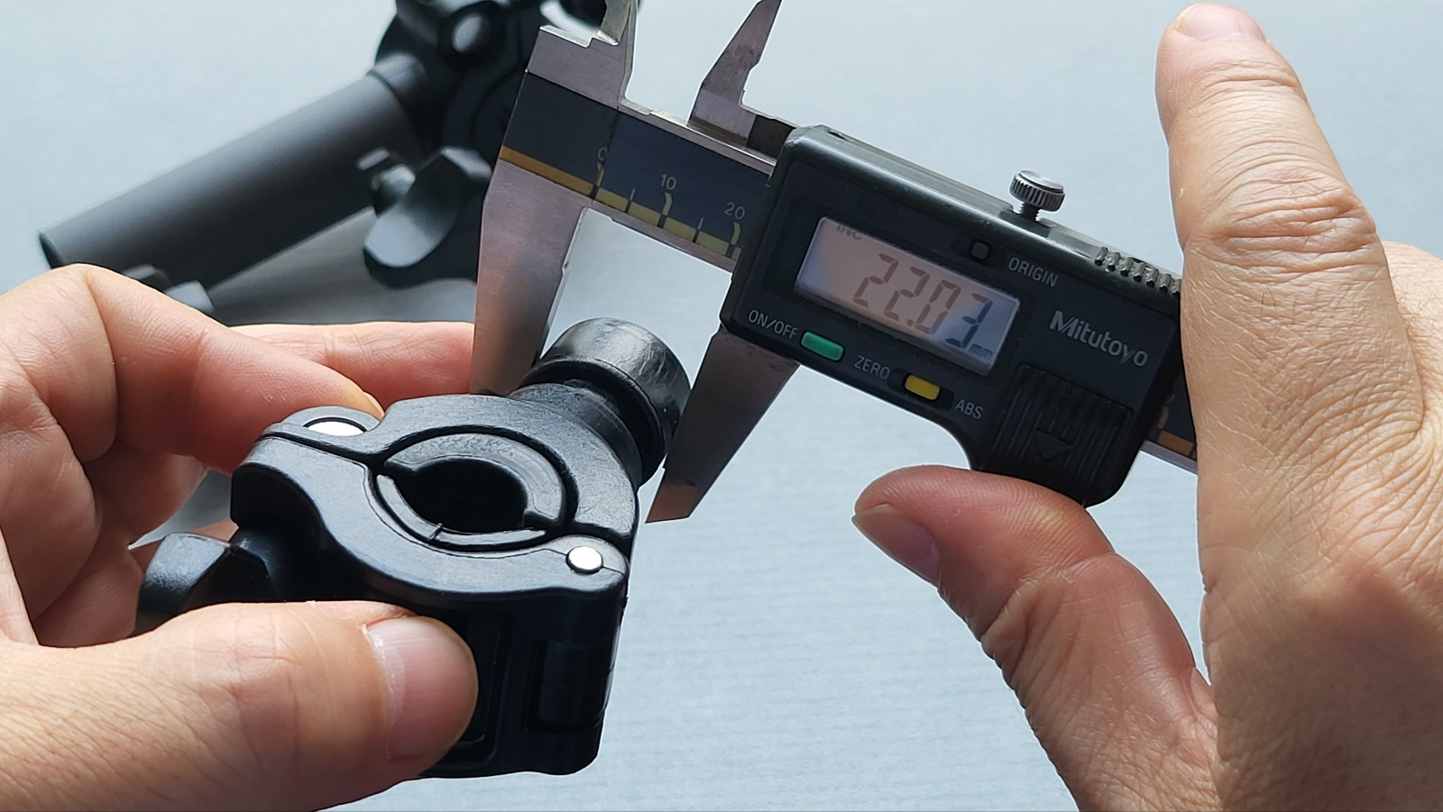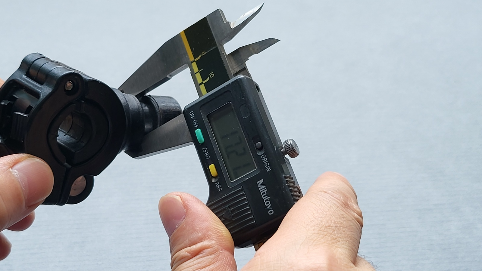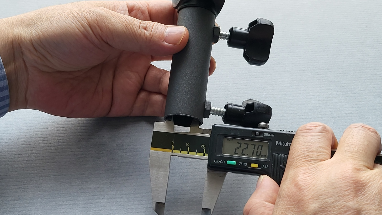 클램프 를 원통외경 25.45 mm 인 것에 연결해 본 것. 빡빡하게 클램프 에 들어가긴 한다. 이것보다 더 큰 지름의 원통은 체결 불가능.