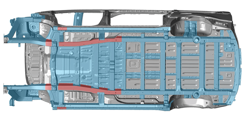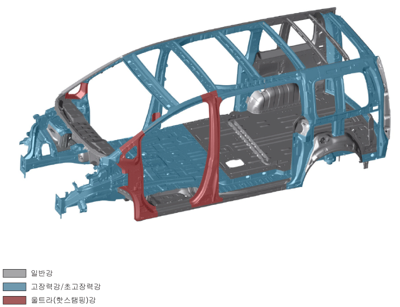 - 붉은색 : 울트라 강,  푸른색 :  고장력/초고장력 강, 회색 : 일반강.