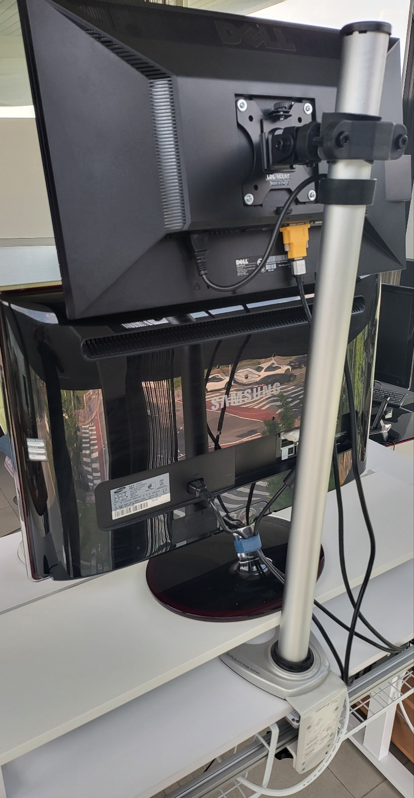 전동식 높이 조절 테이블 뒤에 기존 보유 중이었던 봉 장착하고 여기에 브라켓 으로 모니터 장착.