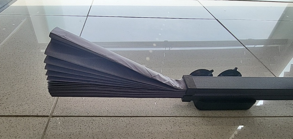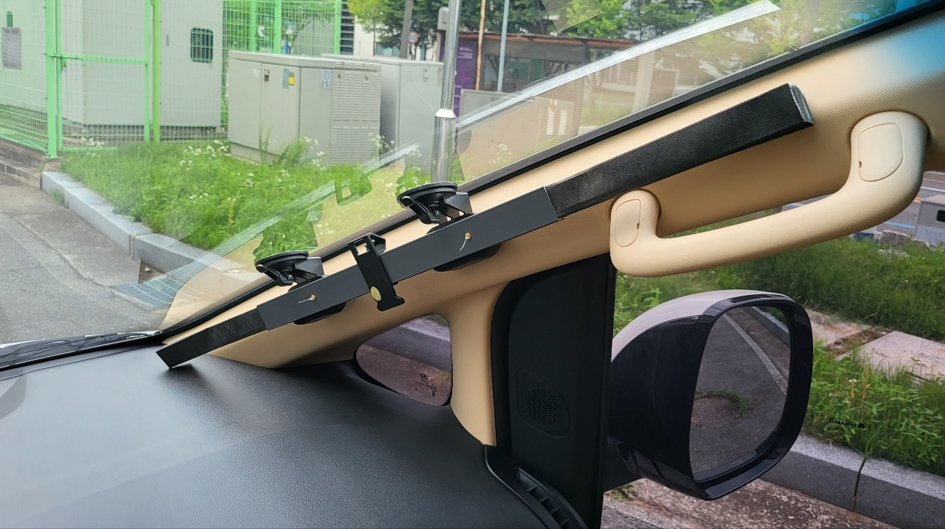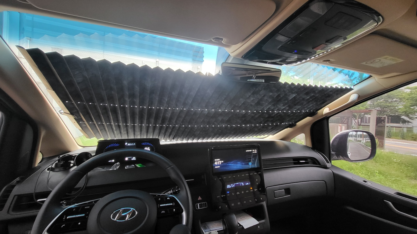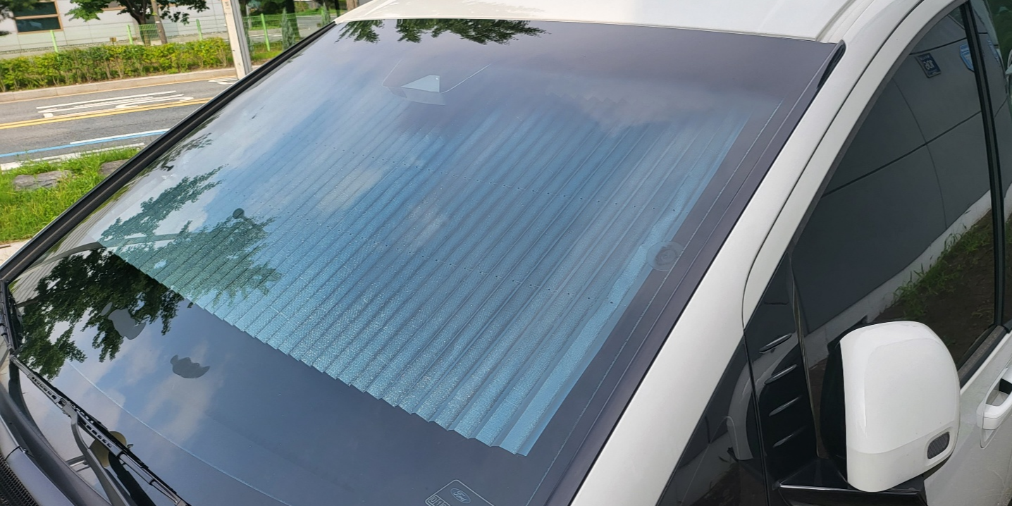 제품 폭은 70cm 이고, 스타리아 전면 유리폭이 90cm 라서 위 사진 처럼 윗 부분으로는 빛이 많이 들어오는데, 선바이저 내리면 모두 가려준다(아래 사진). 제품폭이 조금 더 긴게 있음 딱 좋았겠구만.... 아쉽다.
