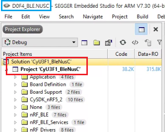 앞의 프로젝트 파일 CyU3F1_BleNusC.emProject 를 SES 에서 열어서 아래 붉은 박스 부분의 프로젝트 이름과 솔루션 이름 모두 신규 프로젝트 이름으로 수정한다. 아래 파란박스에는 이전의 프로젝트 이름이 보이고 있는데 , 프로젝트 이름 수정한 이후 SES 재실행하면 신규 프로젝트 이름으로 변경 적용됨.