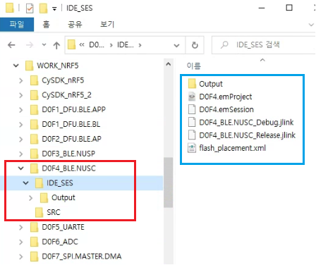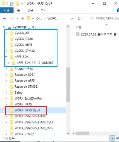 이전 폴더 구성과 달리 SDK 류(아래그림 파란 박스)들이 WORK_NRF5_CyUF 내부가 아닌 동일 레벨에 있는 형식으로 구성되어있다.