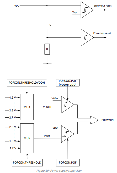 - Power Fail : 지정된 전압값 이하이면 리셋 발생. 적용여부 레지스터 POFCON 에서 설정 가능.