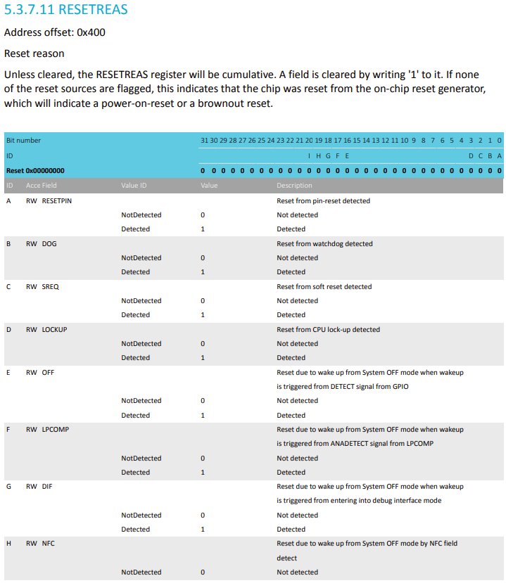 - nRF52 는 총12개의 리셋 요인 있고, 레지스터 RESETREAS 에서 어떤 요인에 의하여 리셋되었는지 확인 가능.
