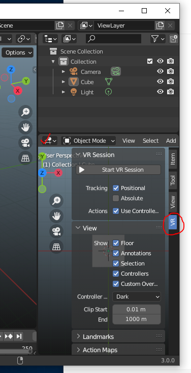위 설정을 하고 나면, 블렌더 우측 사용자 UI 의 3D Viewport 의 sidebar 에 탭 VR 추가 된다 (아래 그림).