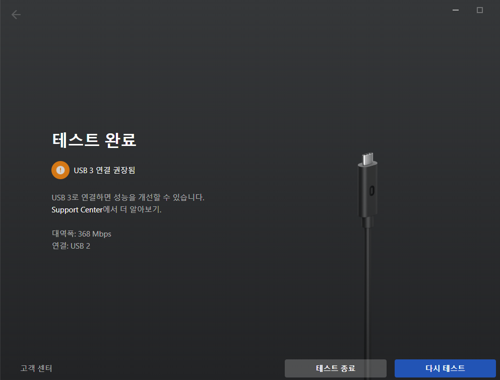 Oculus 앱에서 제공되는 USB 테스트 진행해보면 충분한 통신 속도를 위하여 USB 3 으로 연결하라고 메시지 보여준다.