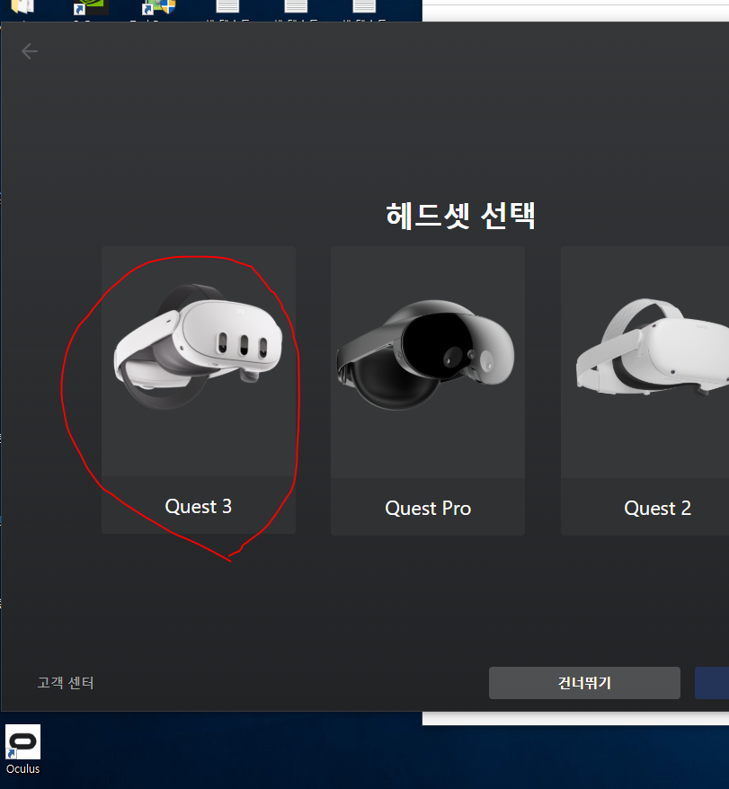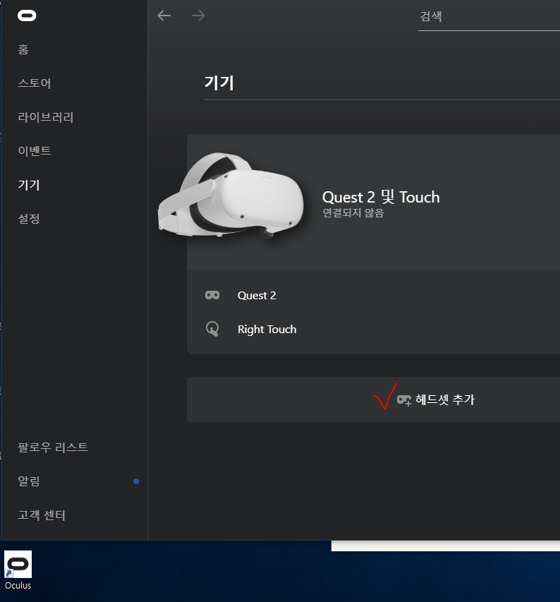 윈도우 Oculus 앱 실행하여, 메뉴에서 기기 클릭, 헤드셋 추가 클릭.