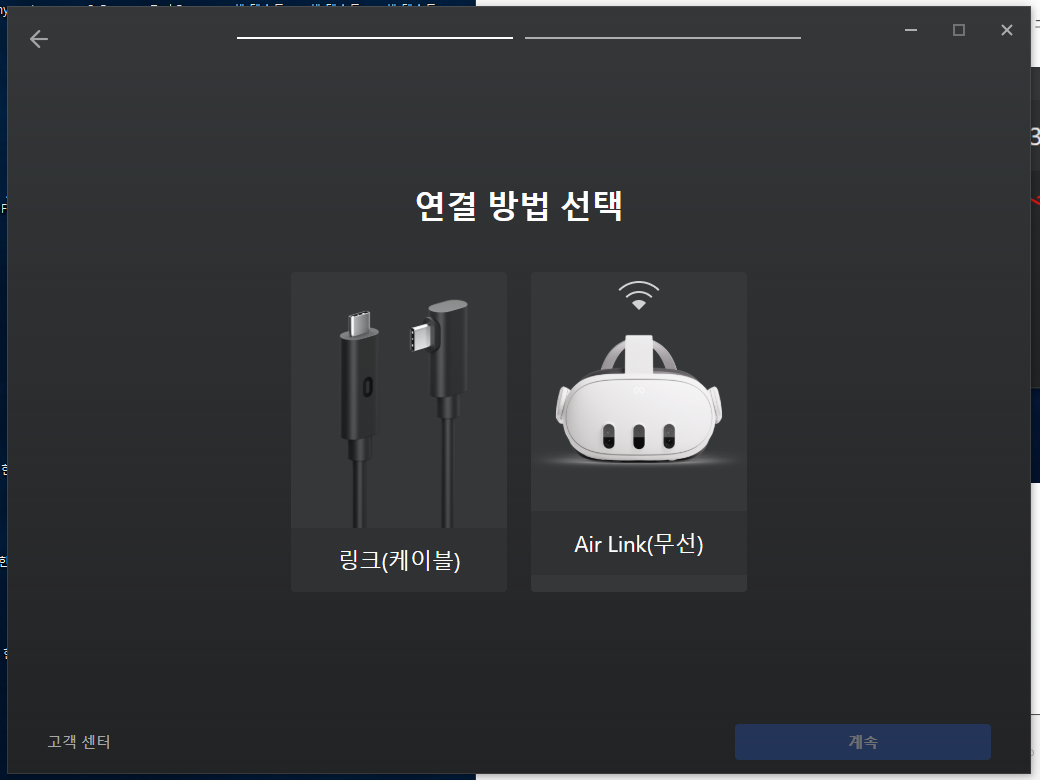 연결 방식에서 유선, 무선 선택 창 보인다. 링크(케이블) 선택하고 계속 클릭.