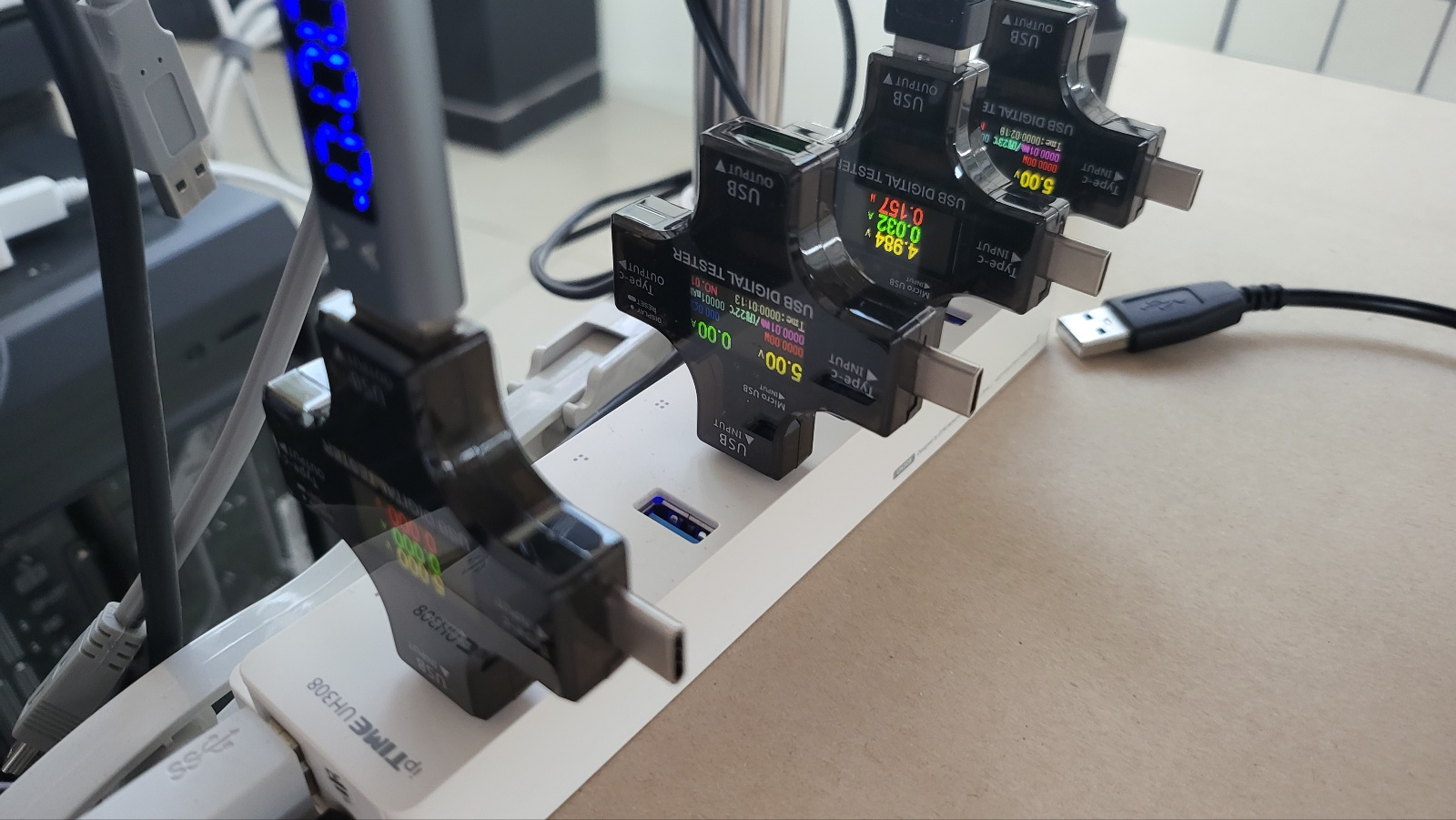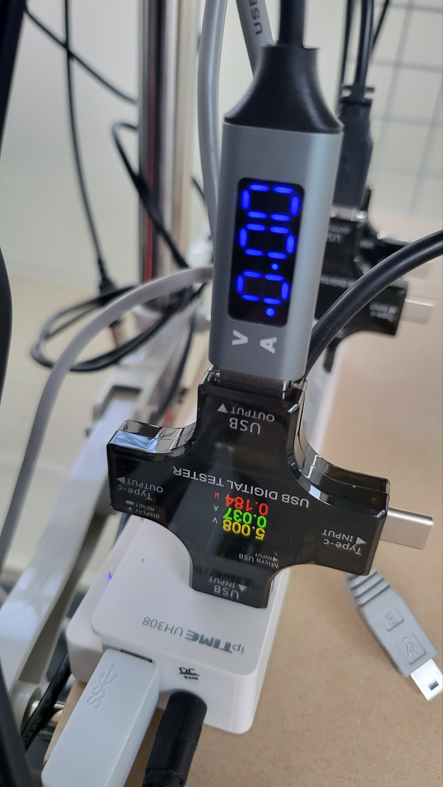- 비교 : 위에 꼽혀있는 것은 이전에 구매했던 소비전류 표시 기능의 USB 케이블인데 정밀도 부실함(실제 기기에서 80mA 전류 소비 중임에도 120mA 보여주는 정도로 매우 부실함. ). 대충 많이 흐른다 적게 흐른다 정도만 가늠할 수 있기에 활용도 떨어졌는데, 이번 구입한 것은 제법 정확.