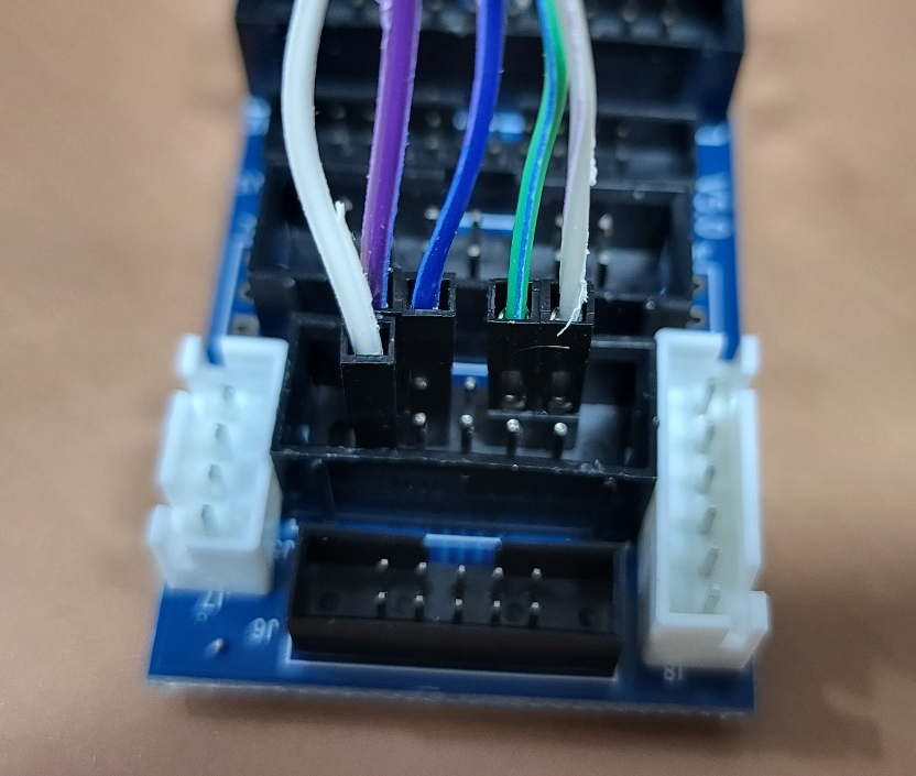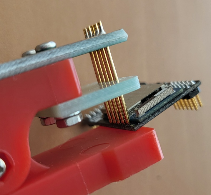 - 집게형 포고핀 1.5mm 피치 5핀 에 J-Link 연결 : 동봉된 어댑터 보드의 핀에 포고핀 집게의 커넥터 연결하여 활용.