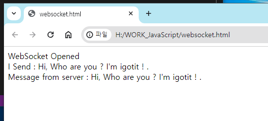 - 위 websocket.html 을 브라우저에서 열면 실행되어 아래 처럼 결과 보여준다.