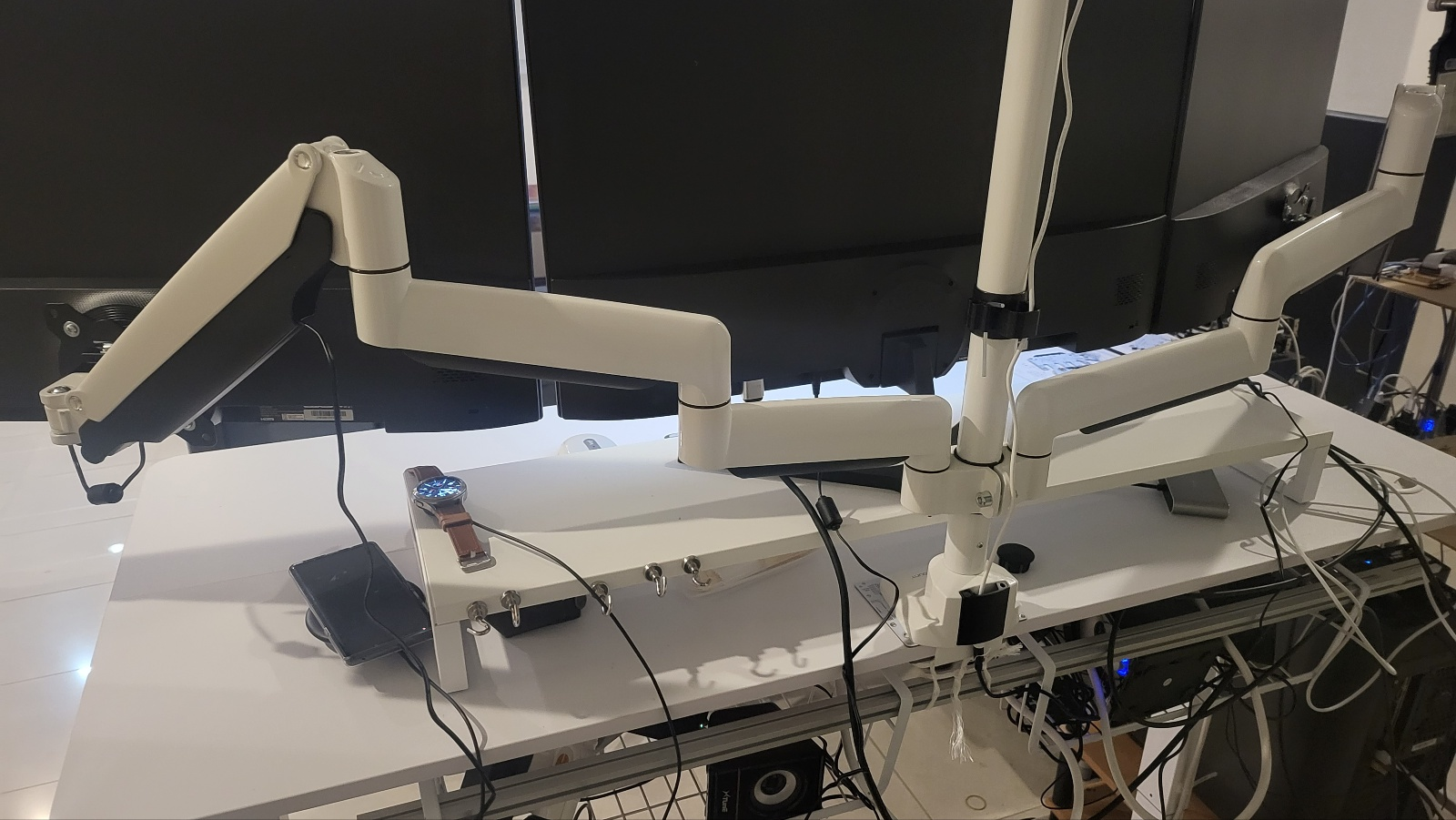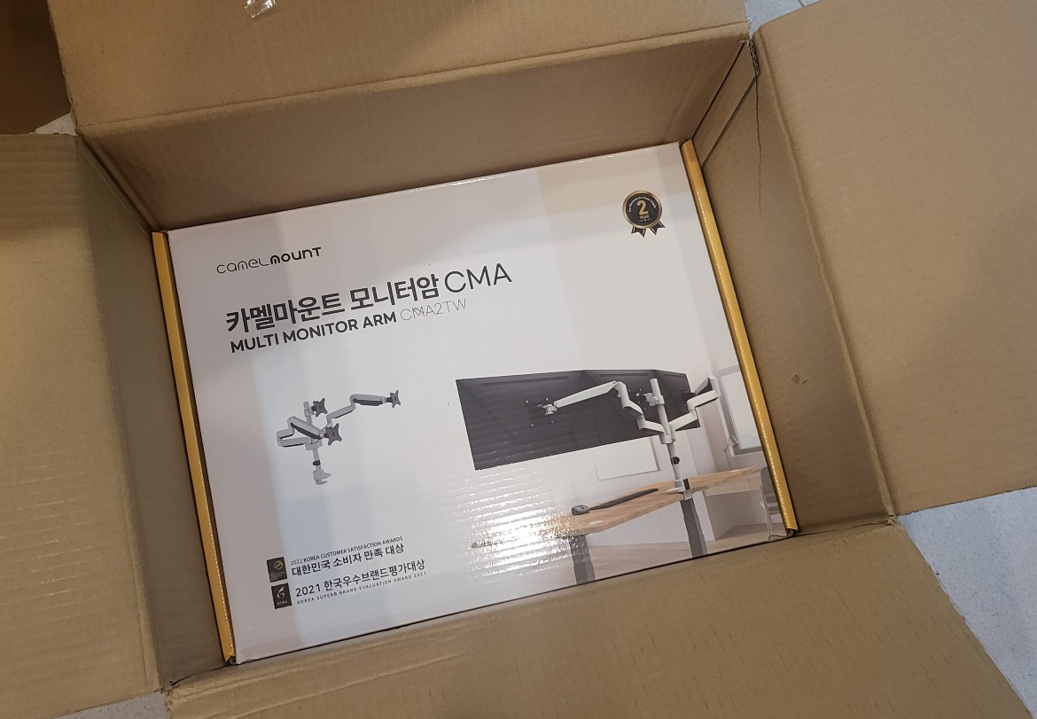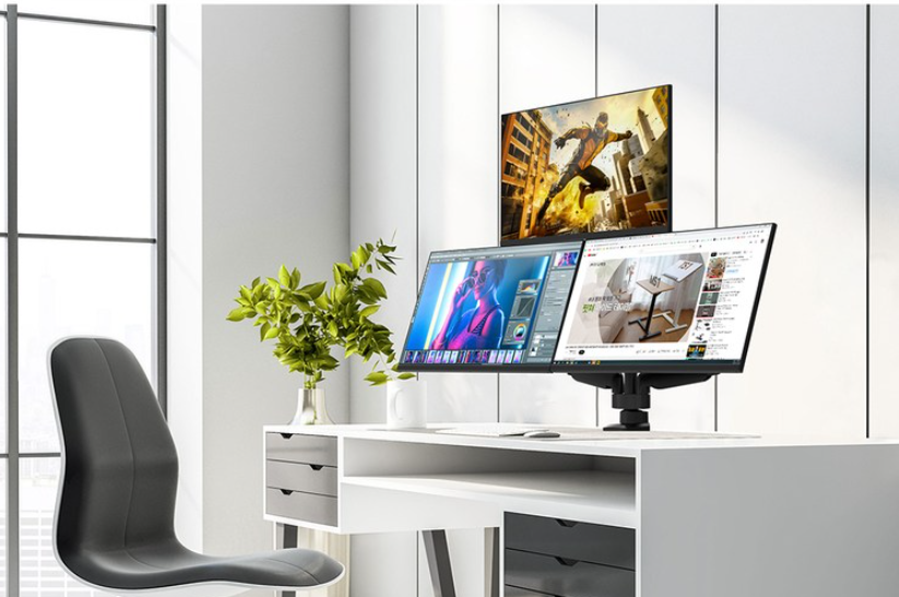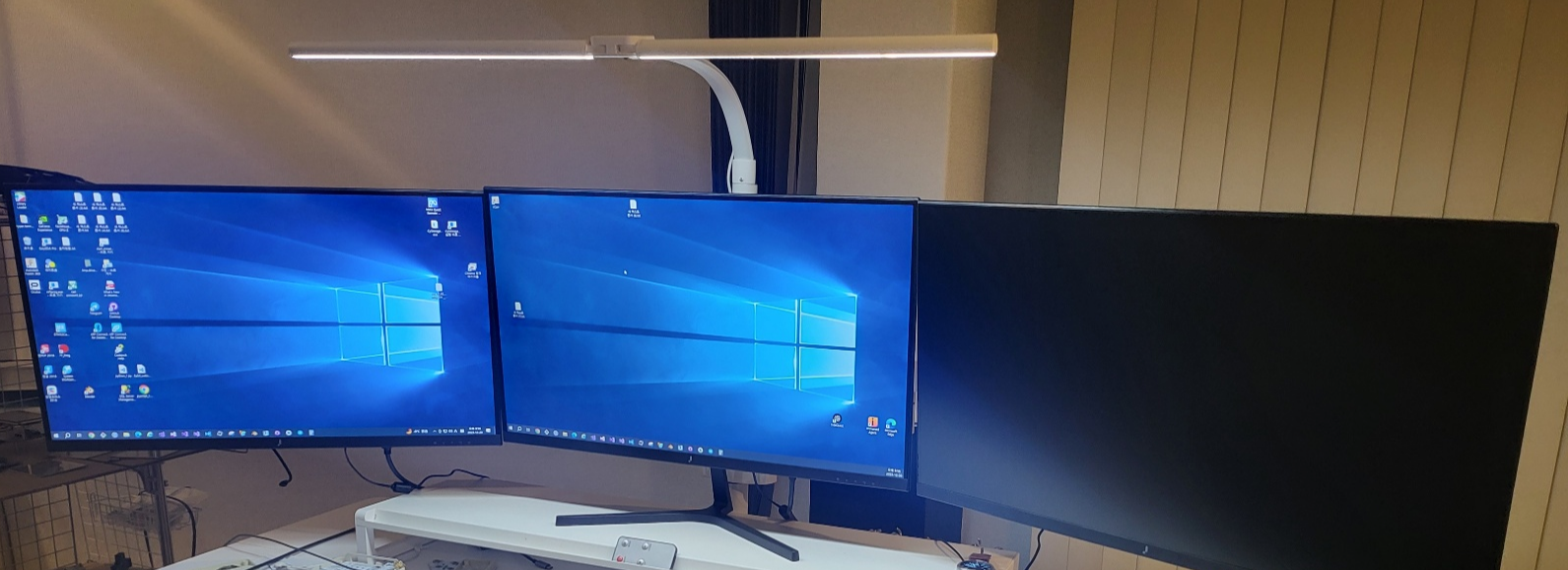 - 모니터 3개중 중앙 1개는 모니터 암에 거치하지 않고, 모니터 받침대 위에 두고 양쪽 2개만 거치하는 방식으로 활용해봄.