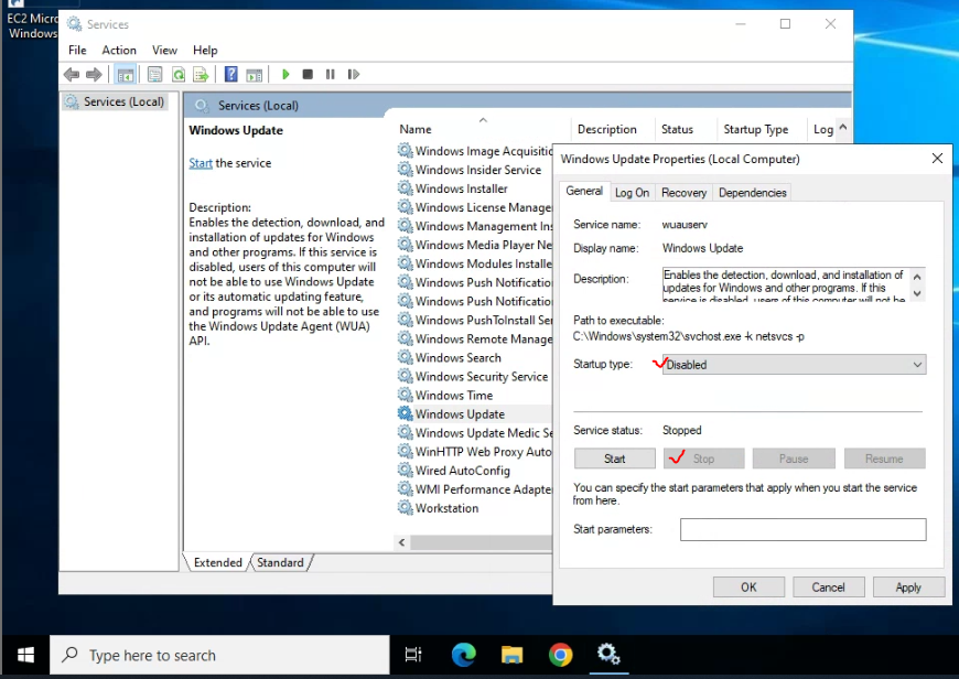 방법 : Serivce 에서 Windows Update 속성에서 아래처럼 Stop 시키고 Startup type 을 Disabled 로 해둔다.