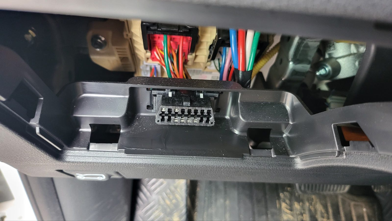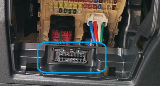 예 : 아래 사진의 파란색 박스 속이 OBD 2 커넥터 ( 차종 : 스타리아 휴즈박스 하단에 있음 )