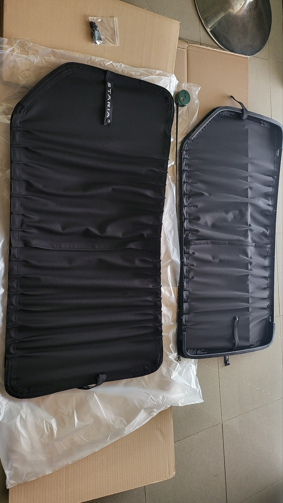 - 커튼 장착된 상태의 프레임 2개와 나사못들.