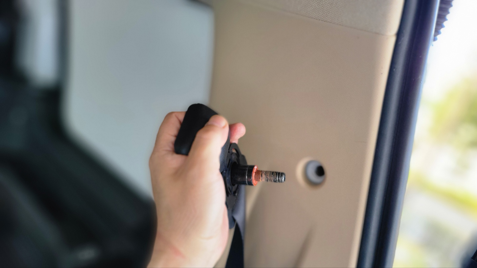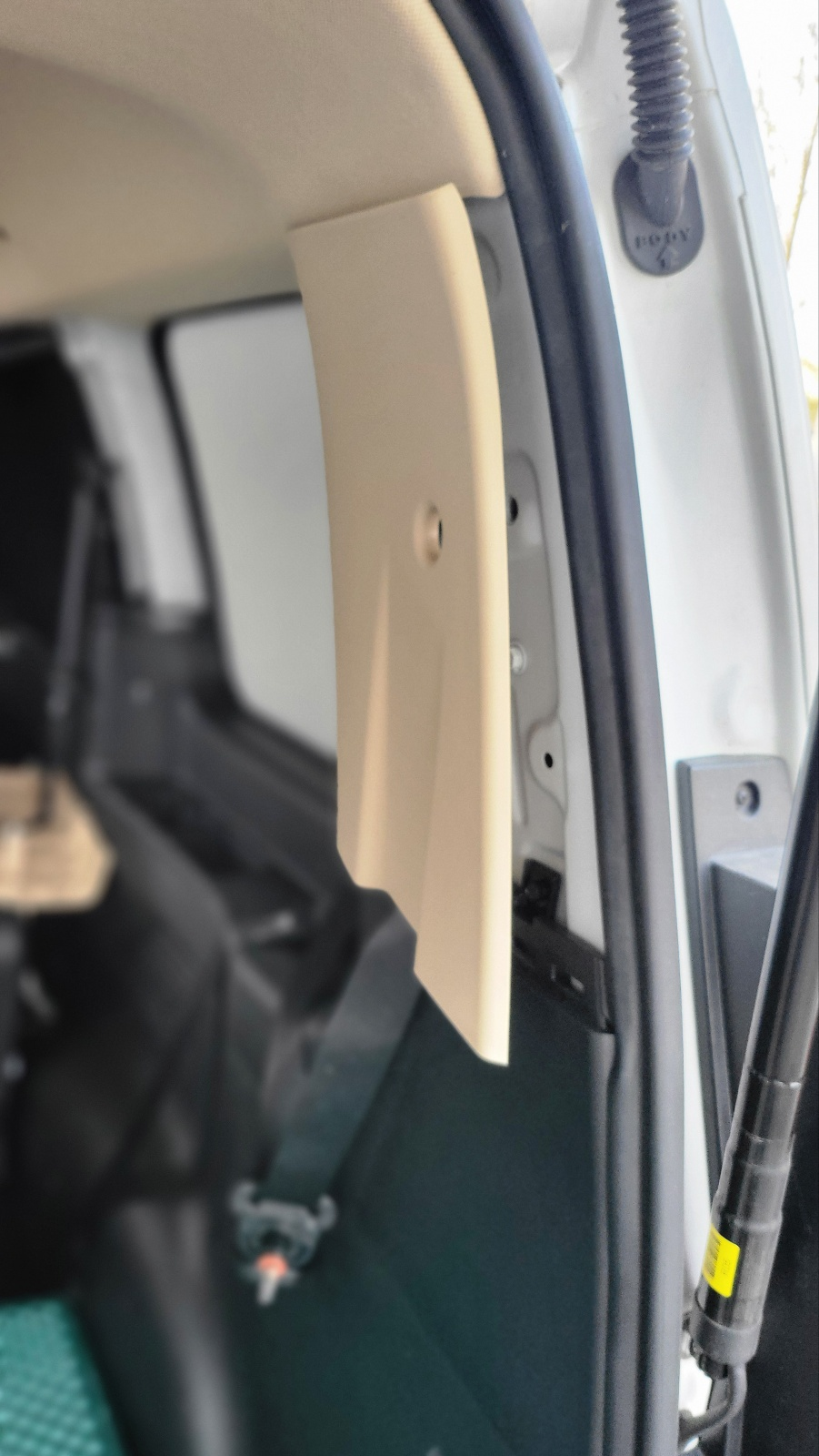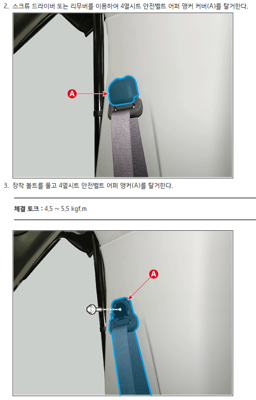 안전벨트 덮개를 개방하면 내부에 볼트 있으며, 매우 강하게 체결되어있다. 이것부터 풀어야 함.