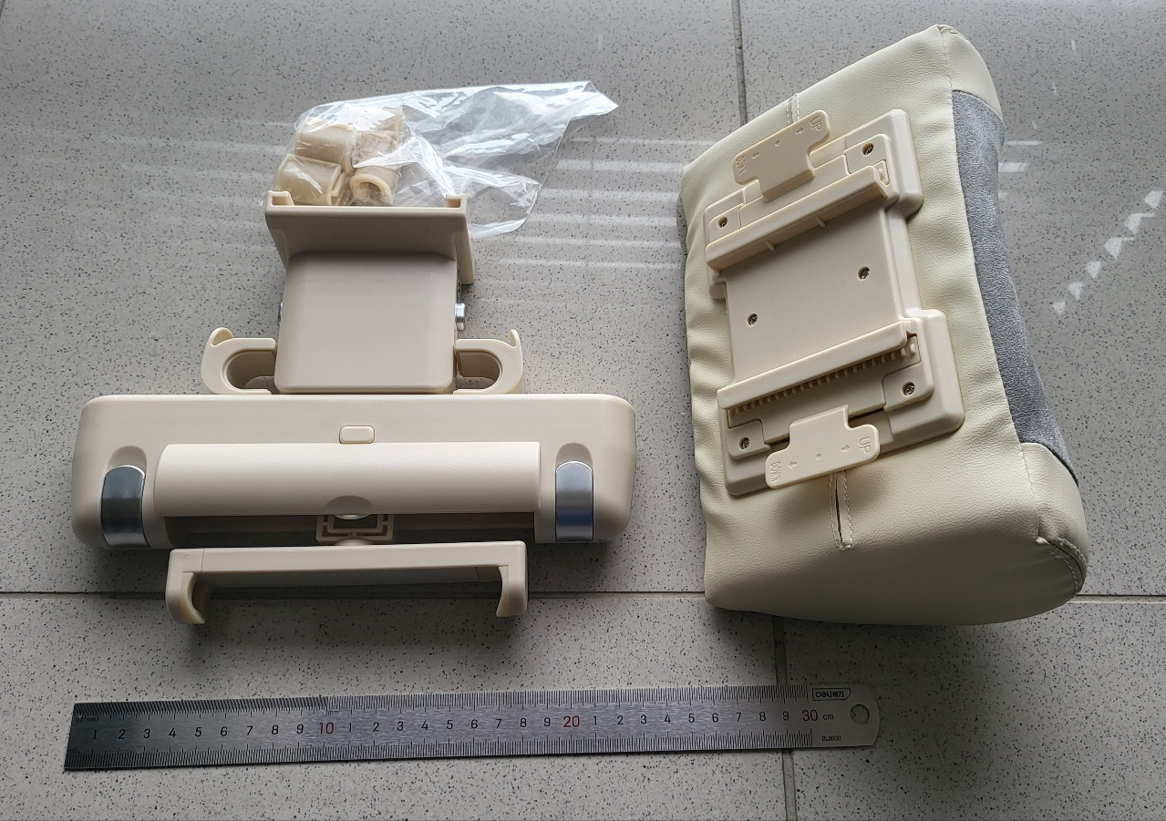 헤드레스트 거치 방식의 목 쿠션 . 의자 뒤에서는 폰 거치 가능.