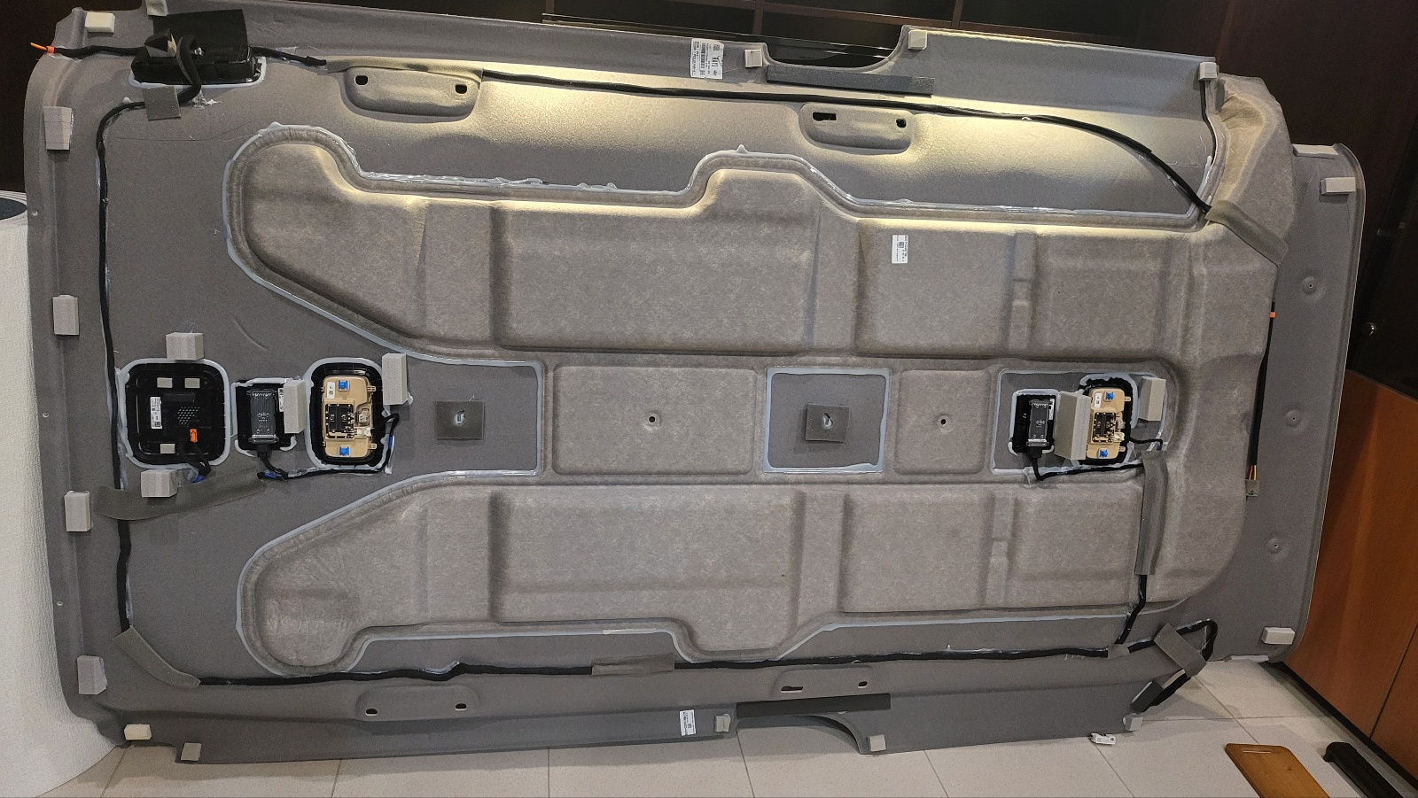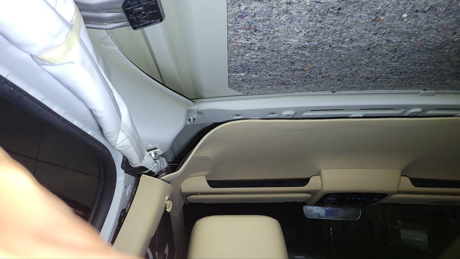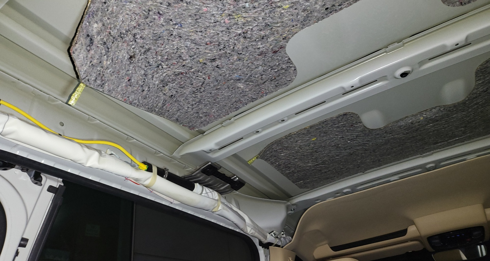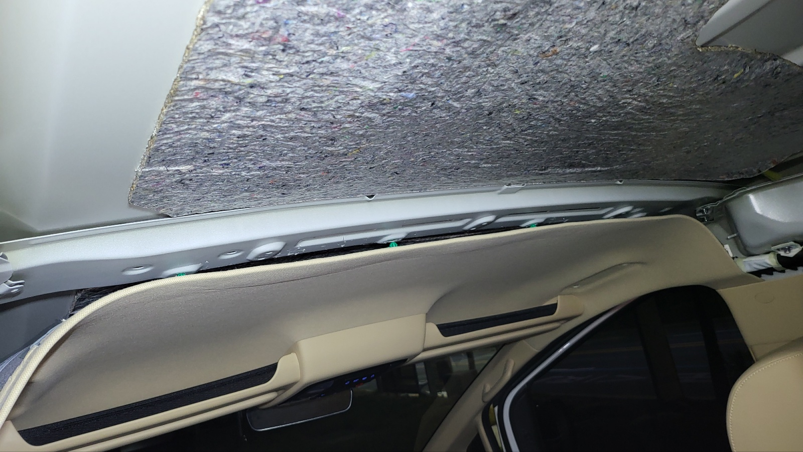 - 순정 천장에 부착되어 있는 저 천은 두께 1cm 정도의 폐섬유로 만들어진 것 같은데, 방진 효과는 약해 보이고 방음, 단열 용도로 보인다.