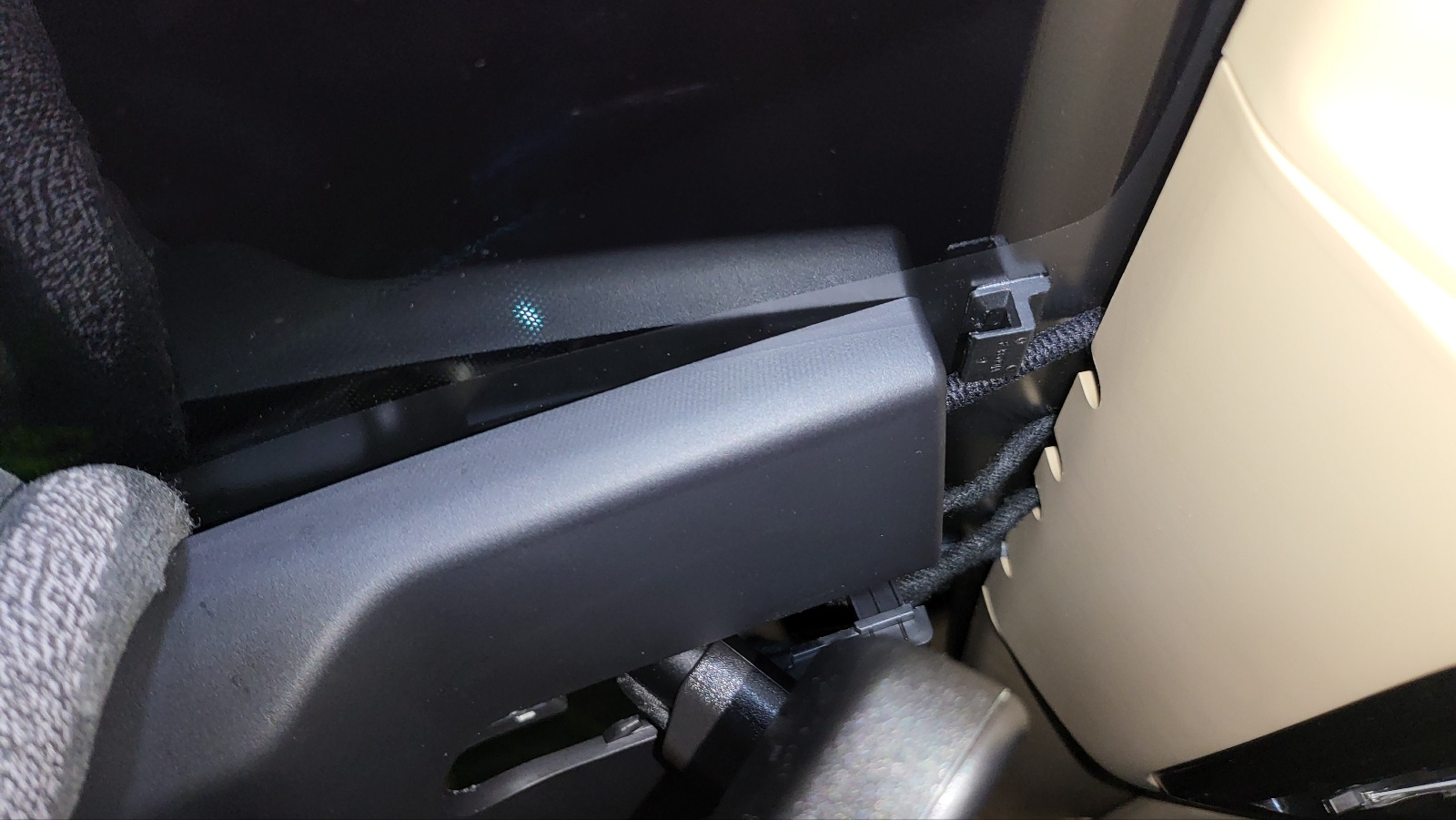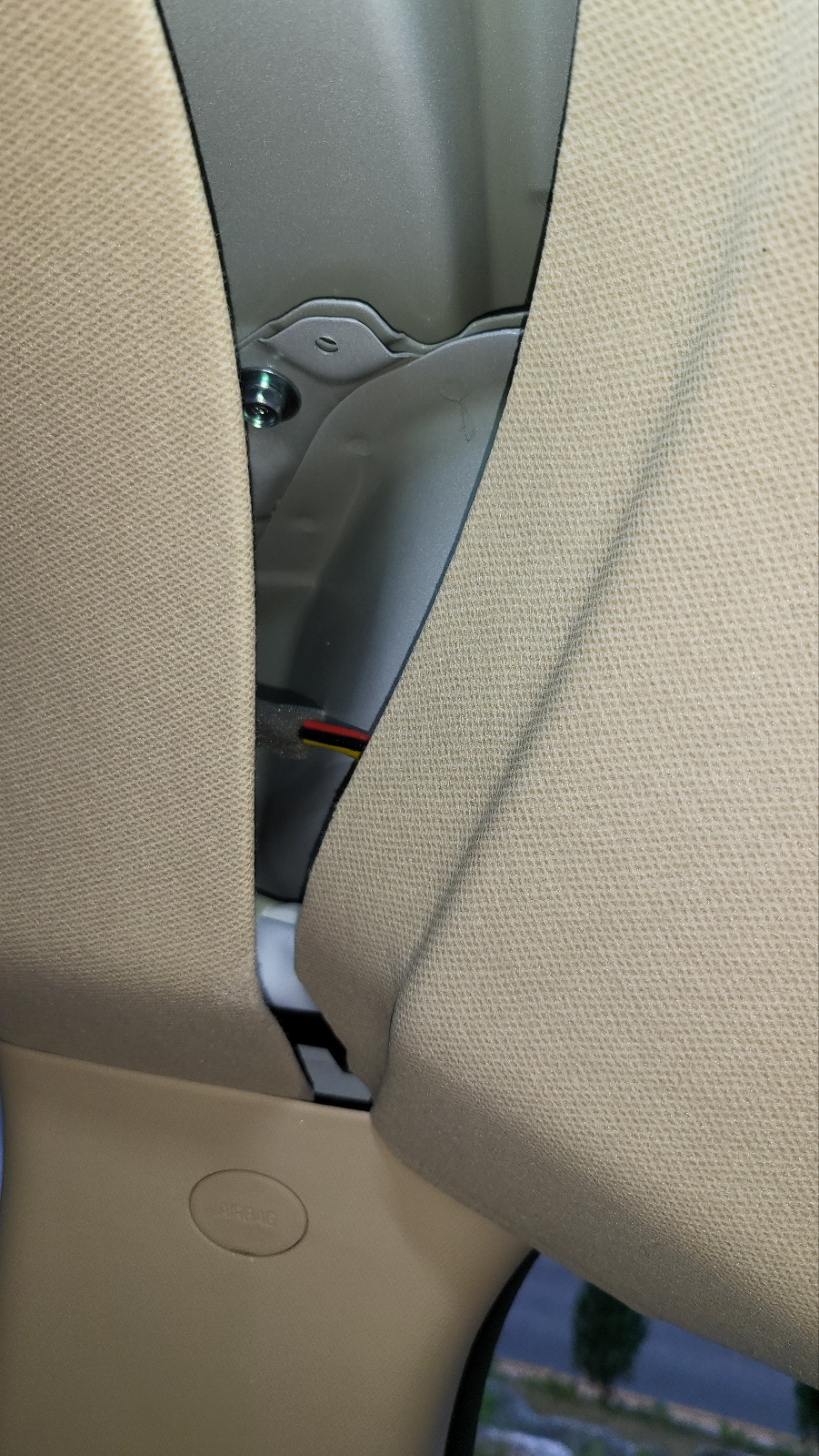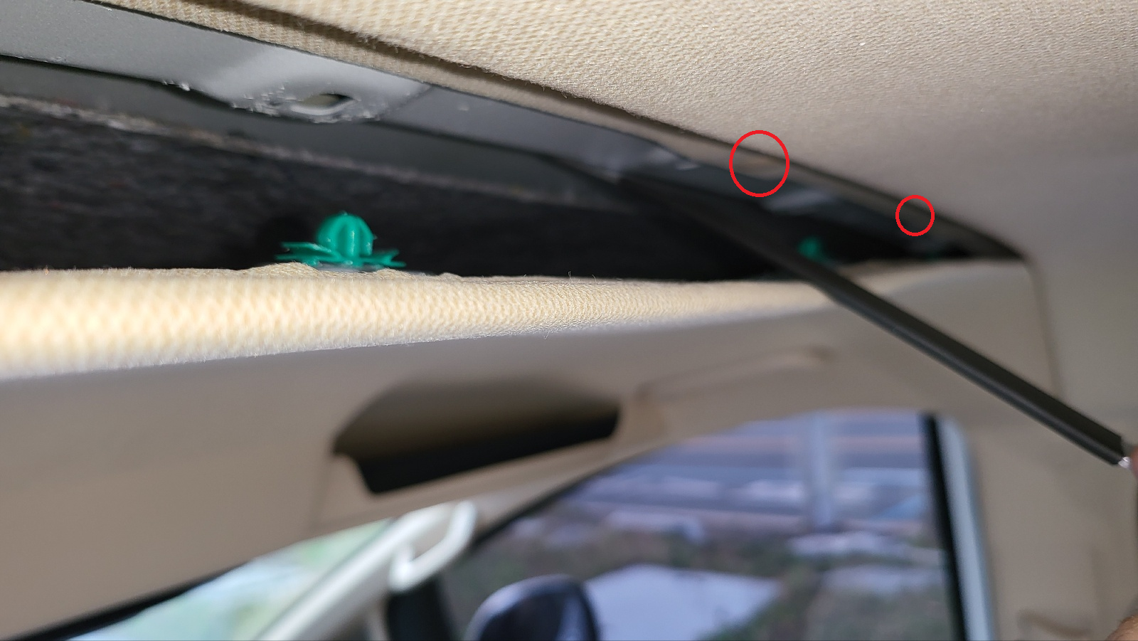 아래사진 : 차량 조수석 위 트림 경계부위에서 보이는 안테나 전선.