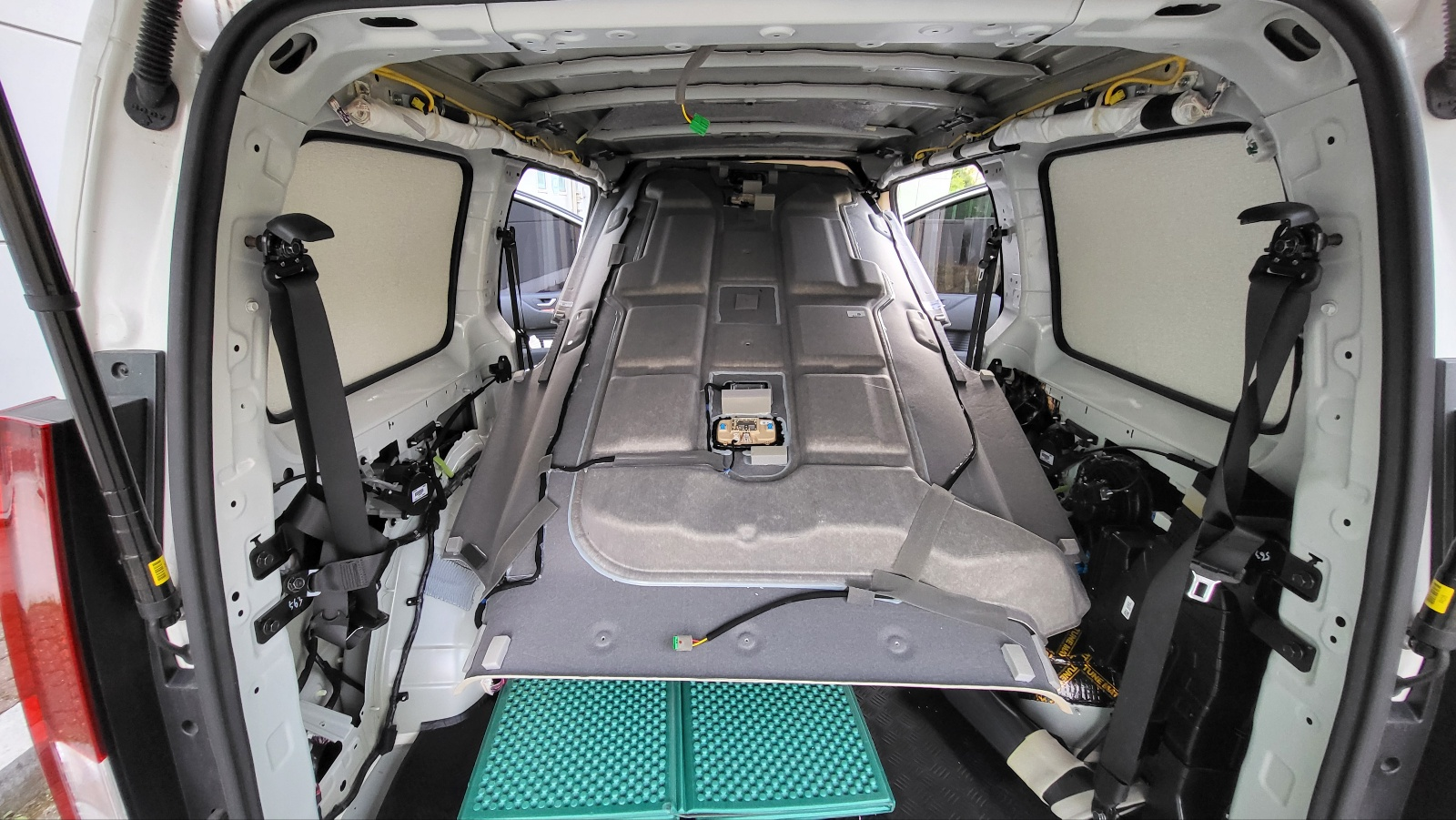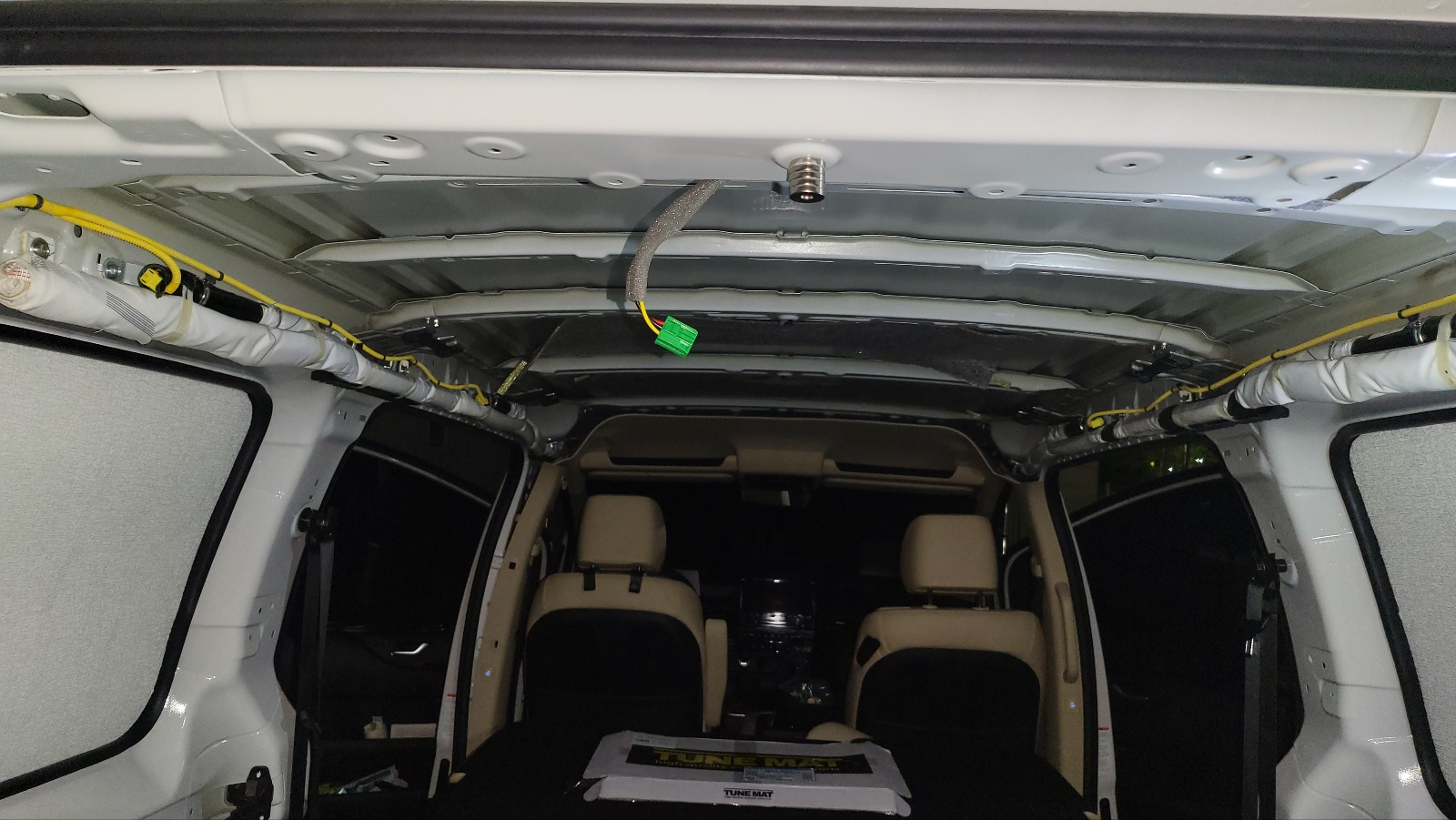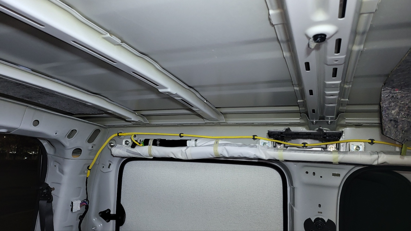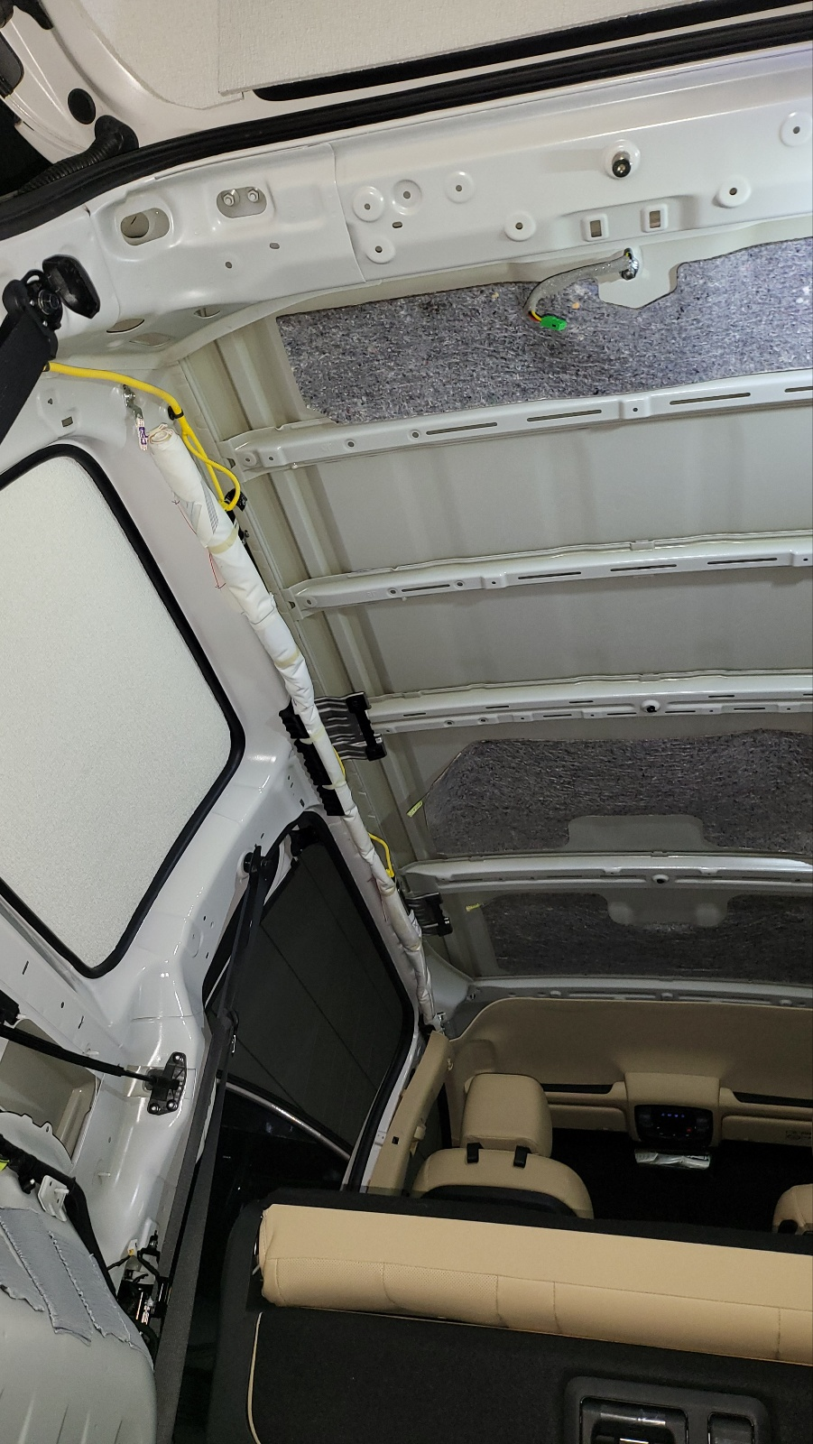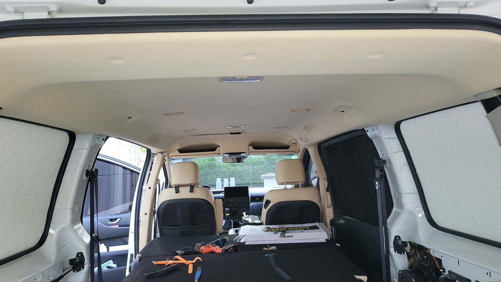 천장 단열 / 방음 천장 철판에 방진매트 부착(상세보기 : https://igotit.tistory.com/5335 ) 해둔 상태에서 단열, 방음 작업 진행. 운전석 뒤쪽 지붕 철판의 오목한 부분에는 5mm 두께 단열벽지 먼