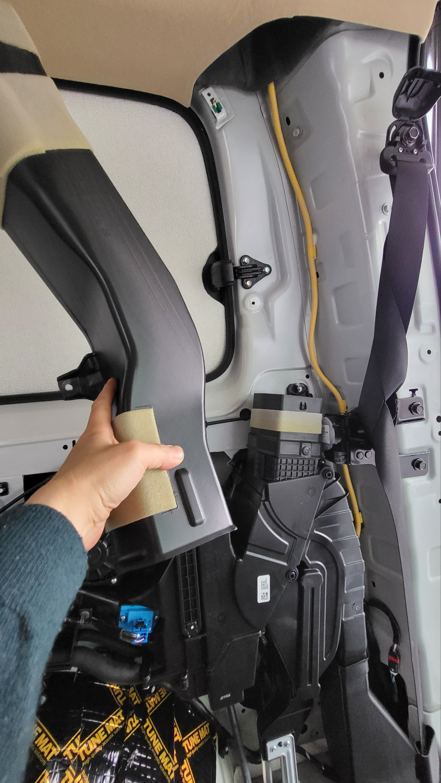 - 하 .... 그런데 군데군데 떨어져 전체 면이 밀착되어있지 않고, 심지어 쓰레기 (아래 사진의 노란색 노끈 ) 도 5개 정도가 붙어 있다. 저기요... 현대차 제조 라인에서는 이 정도 저품질 작업 상태로 통과되는 거임? 접착이 떨어진 것까지는 제조 이후 여름철 열받아 떨어질 수 도 있기에 억지로 라도 이해 가능하지만,,, 저 노란색 노끈 쓰레기는 절대 이해 불가하다네... 작업 이 따위로 할 거면 퇴사해라... 그게 당신도 행복하고 고객도 행복한 거라네..