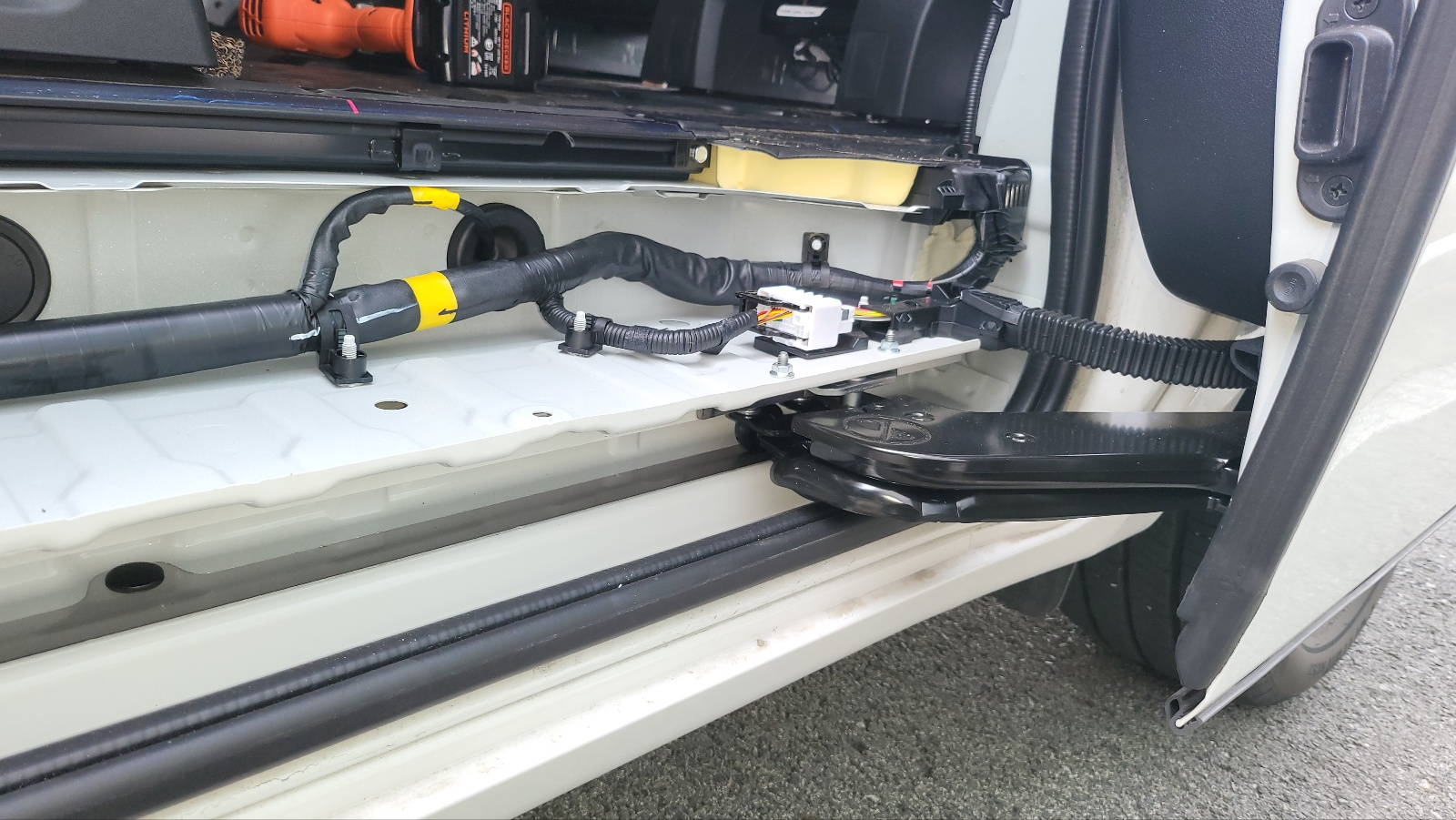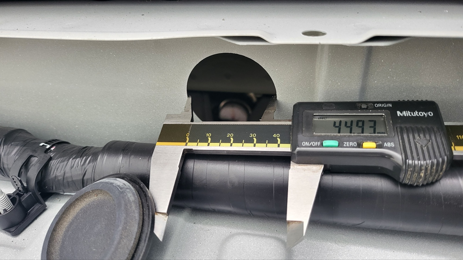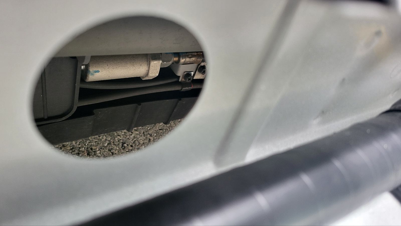 위 사진의 원형 검정색은 고무재질의 구멍 마개이고 이것 빼보면 지름 45mm 구멍이 있고 차체 하부로 직결되어 있다.