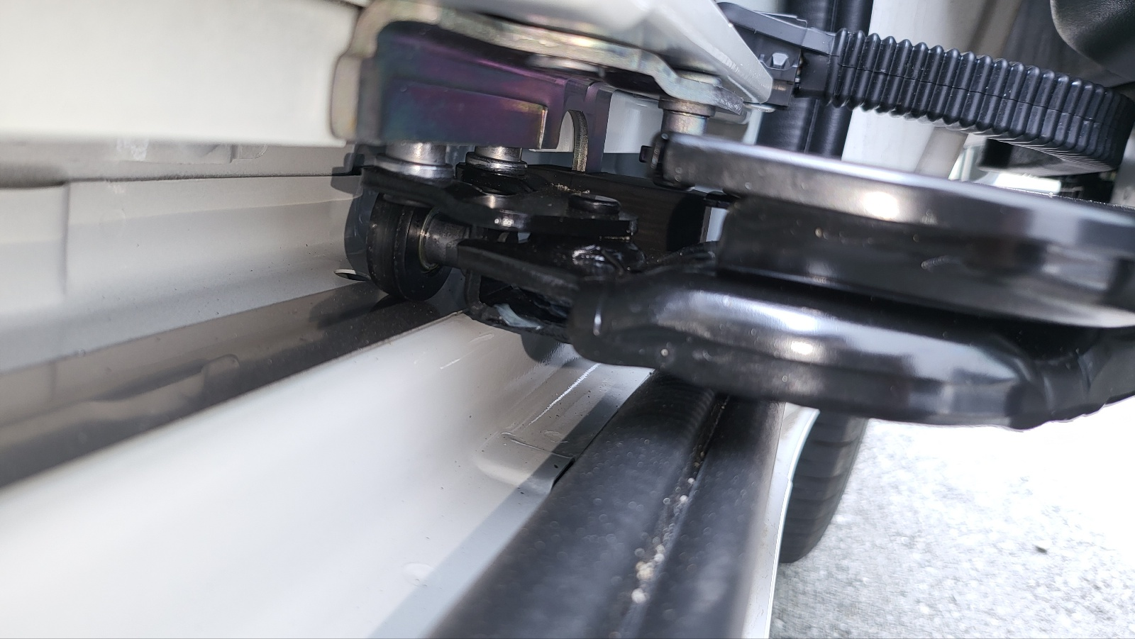 위 사진에 보면 슬라이딩 도어 레일 금속 판이 보이고 금속 판위에 롤러 있는 구조. 아래 확대사진.