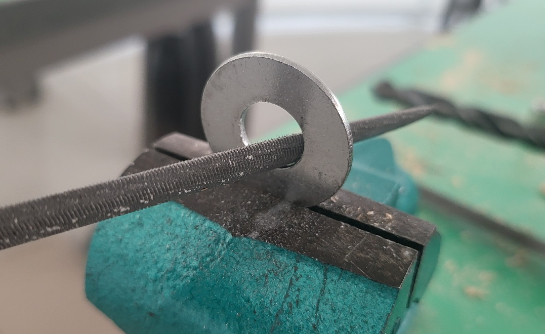 아래 사진은 와셔 내경 10.7mm 인 것을 0.2 mm 정도만 넓히기 위하여 줄로 갈아냄.
