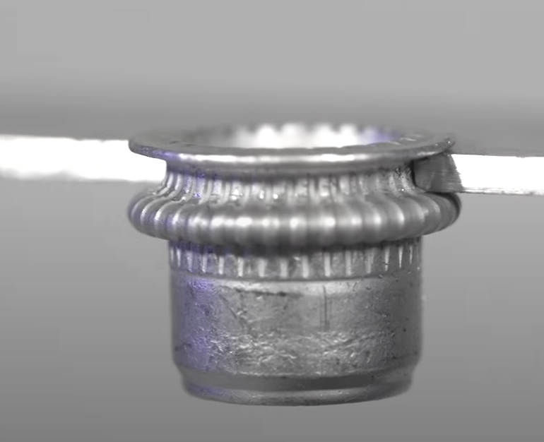- 아래 팝너트 체결 구조를 보면 대상 철판을 잡아주는 면적이 넓지 않다. 이런 구조에서는 대상 판재가 얇은 경우 너트 압착된 홀 경계지점이 조금만 휘어져도 팝너트 빠져 버린다. 팝너트는 대상 판재 자체가 충분한 강도가 있는 경우에 적합하다.
