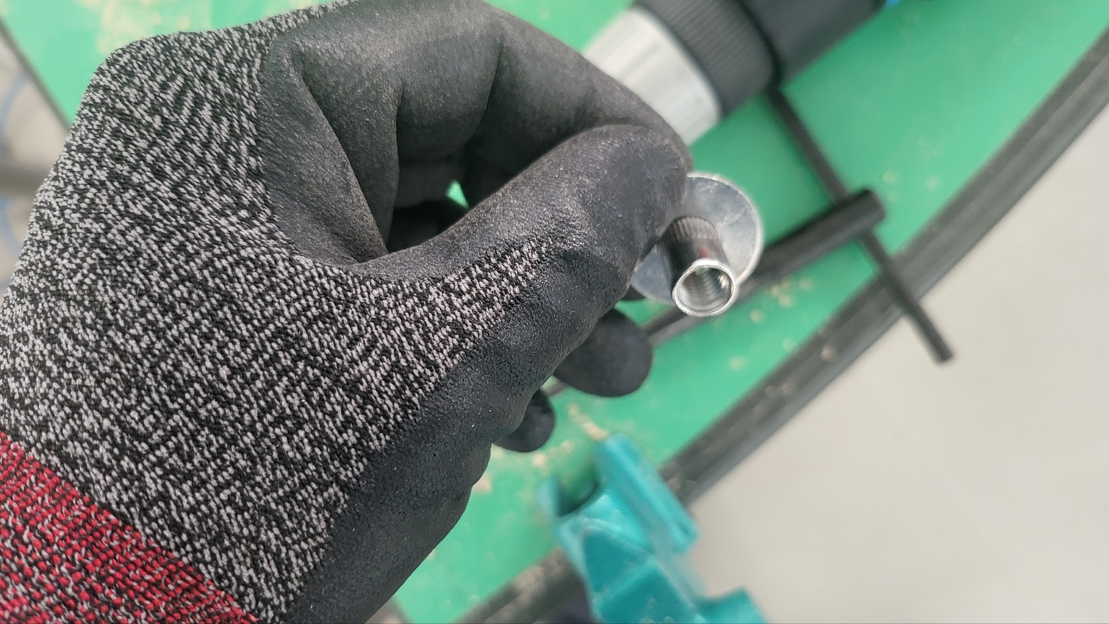 - 아래 사진 처럼 삽입너트 머리 부위에 보강 철물 넣어 대상 판재에 압착한다.