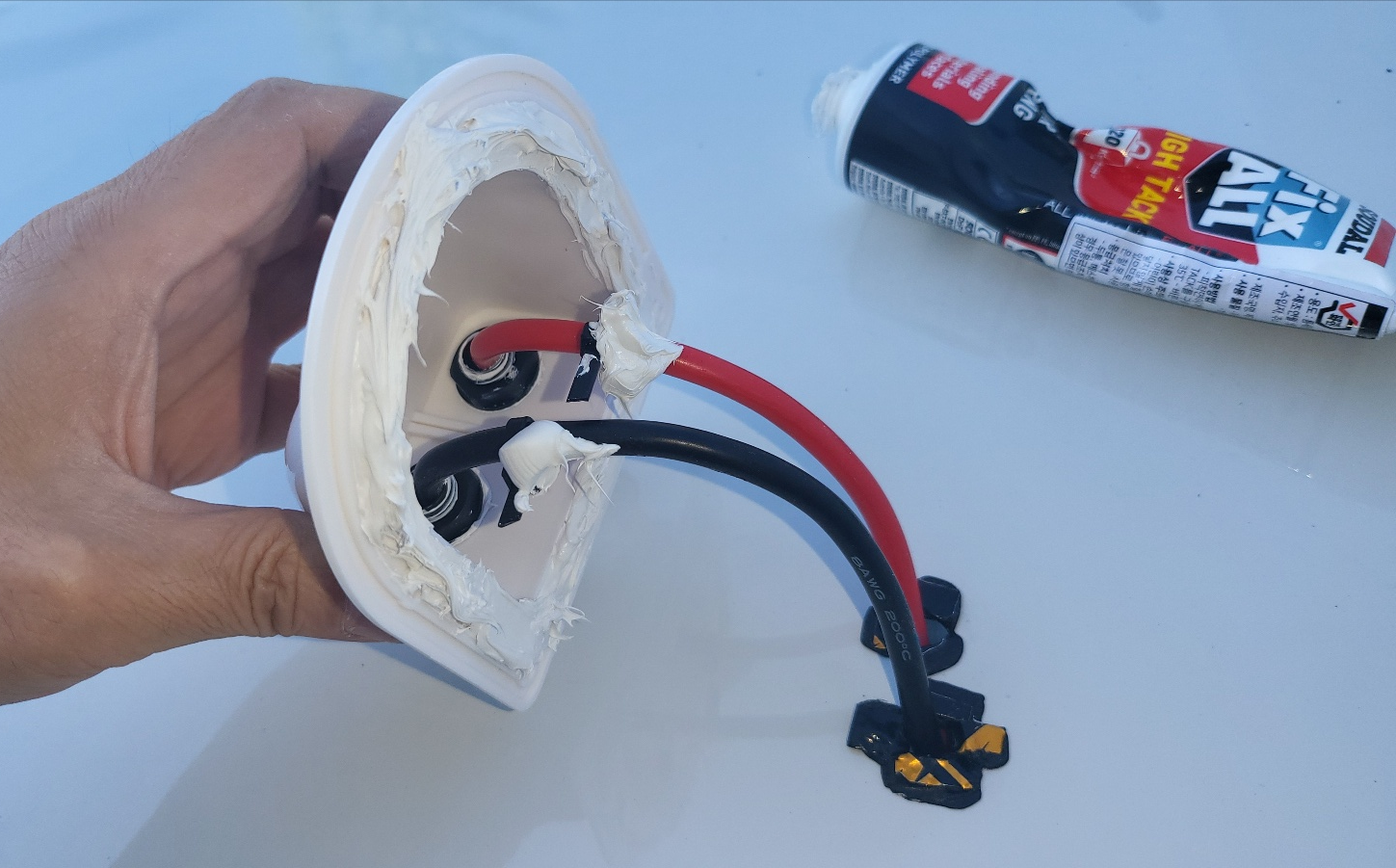 실리콘이 살짝 삐져나올 정도로 압착 . 이 상태에서 하루는 지나야 완전 경화됨.