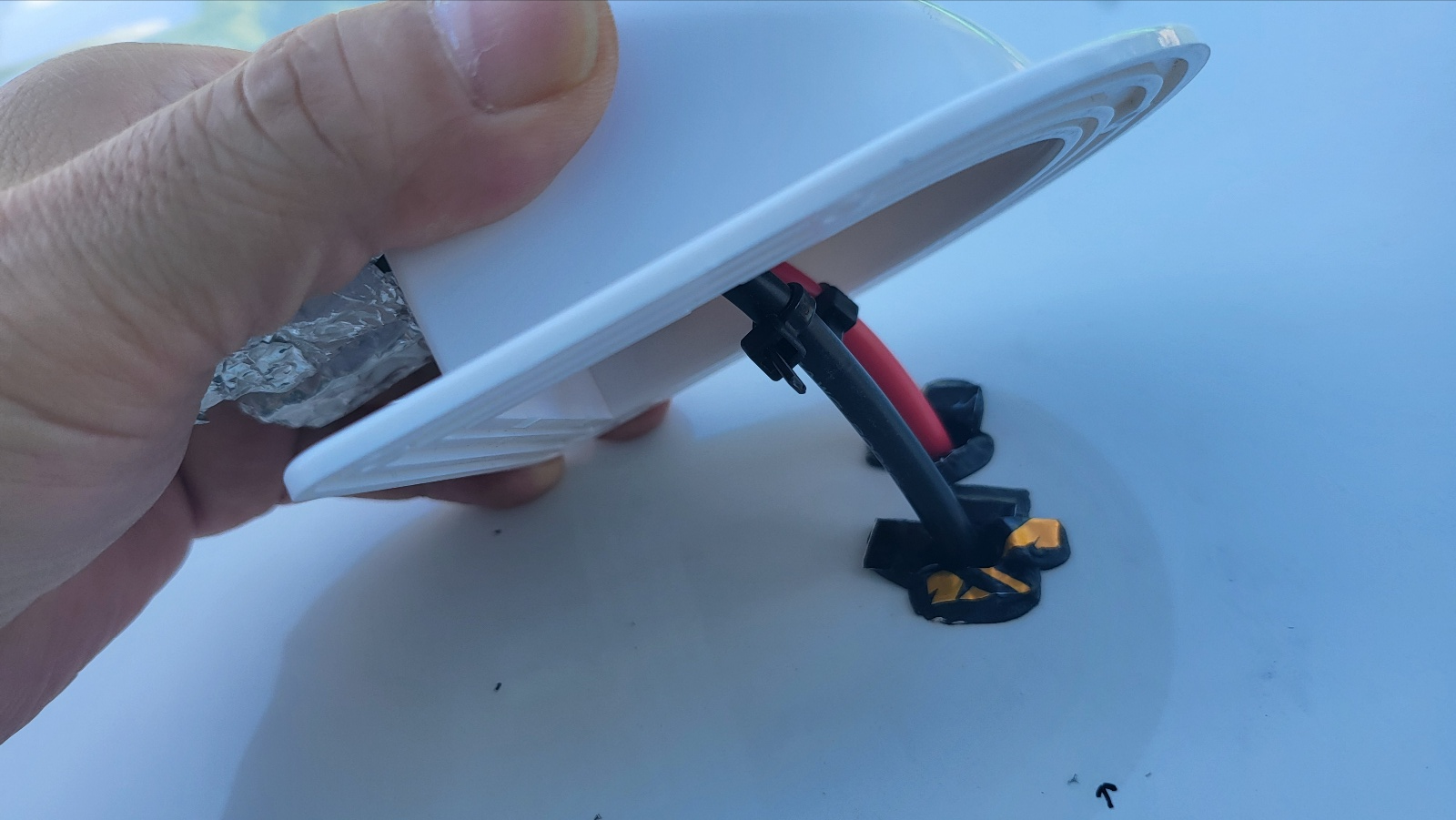 지붕으로 나온 전선 각각을 타이로 가볍게 묶어둔다. 타이가 전선에서 슬라이딩 가능할 정도로 살살.