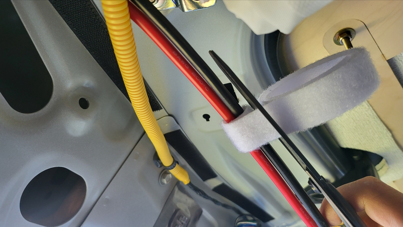 - 차량 벽면에는 양면 접착식 벨크로의 까슬이를 붙여줬고(아래 사진에서 검정색), 전선에는 감아서 사용 가능한 벨크로 의 표면이 보슬이가 되도록 감아준다.
