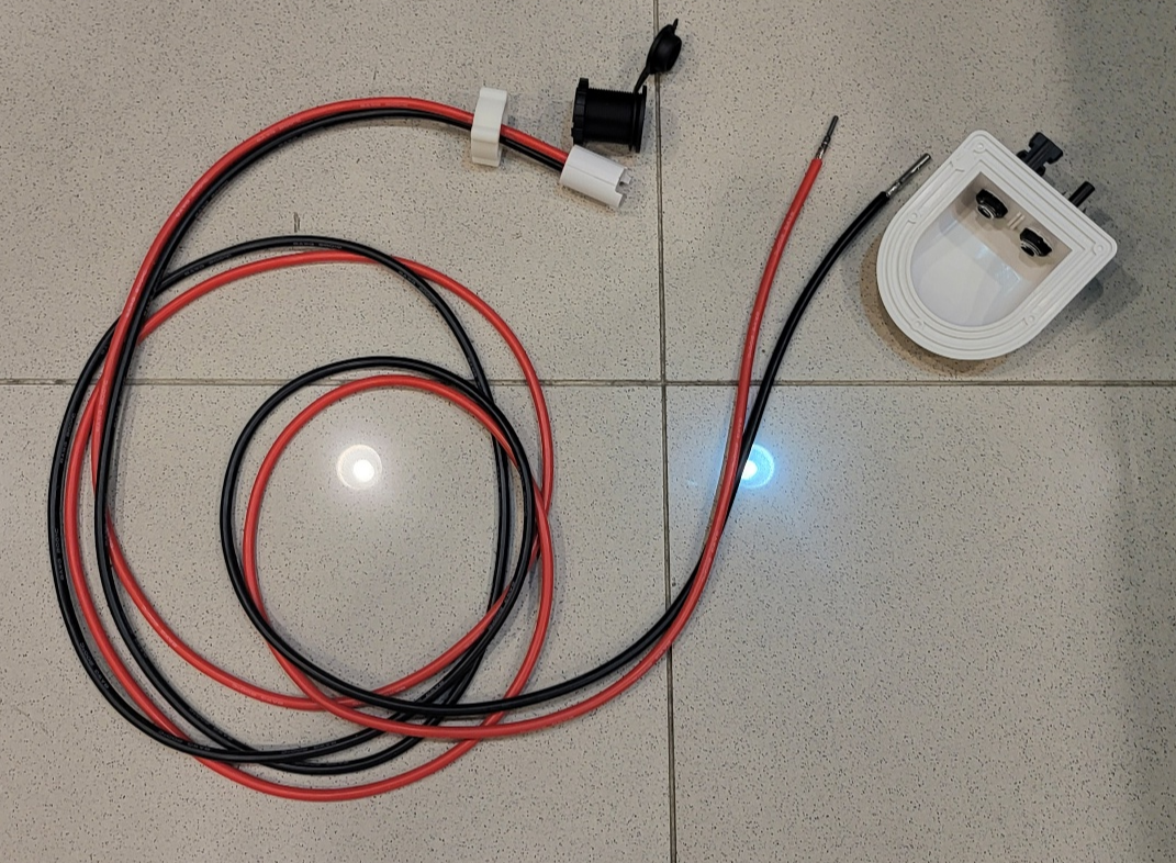 실리콘 피복 전선 8AWG 길이 2.5m , 전선의 끝단에는 XT90 커넥터 (단자 암컷)로 하였고 , 전선의 반대편에는 MC4 단자 연결 . 차량 지붕에 장착할 MC4 커넥터 달린 마감재 .