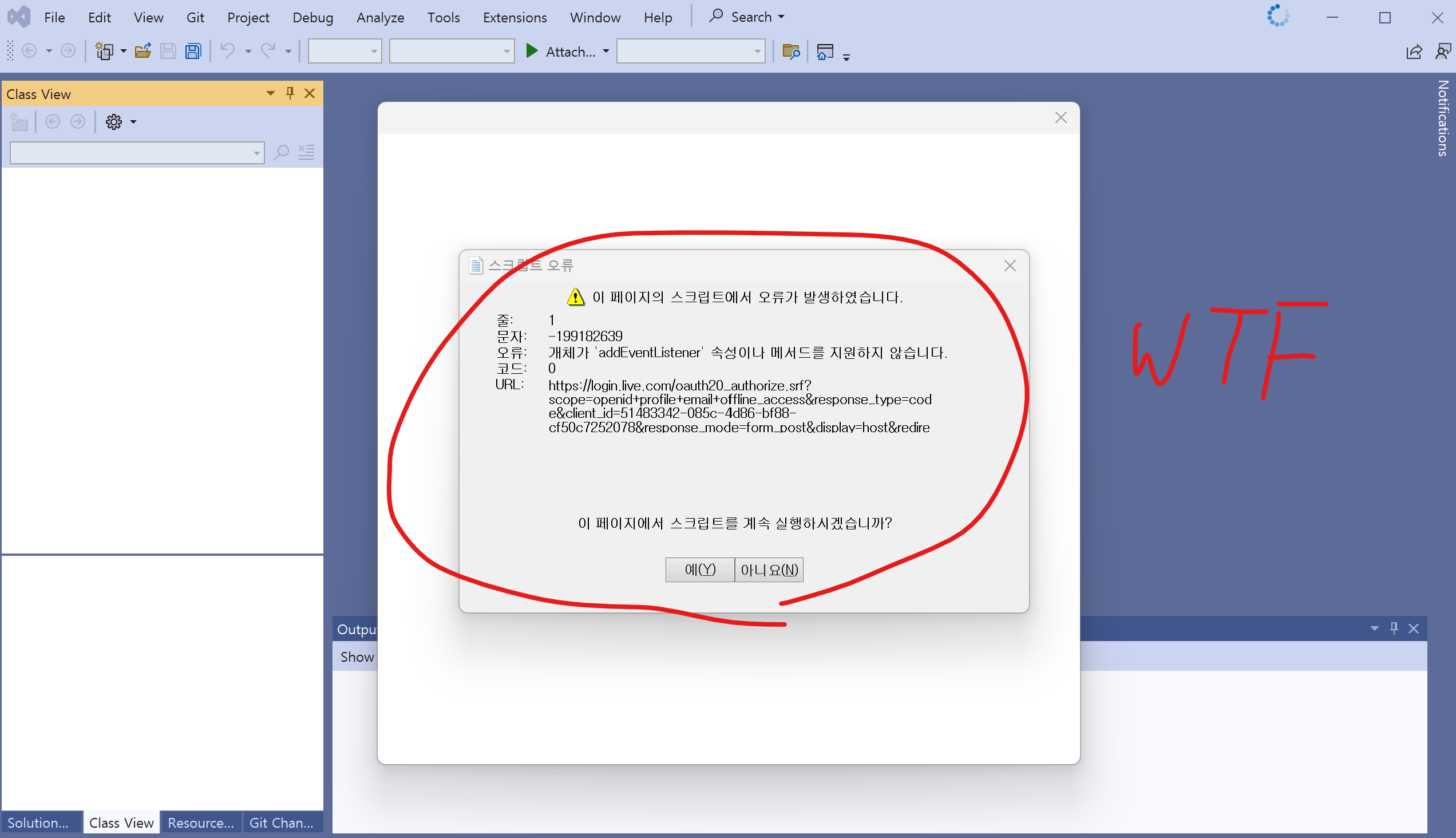 MS 사는 지들이 만든것들 내에서도 오류를 뿜어내는 쓰레기 브라우저 포기하는 게 더 좋겠구먼... 계속 사용자 괴롭히는 심뽀가 뭐야? 계속 유지하려면 최소한 니들이 만들어 낸 것 내에서는 멍청한 오류는 없도록 기본은 달성해야지? 이게 뭐니? 이전 VS2013 때부터 저 스크립트 오류 한 십 년 이상은 봐온 거 같구먼... 휴..... MS 가 AI 를 한다.? 그 AI 인간 괴롭히는 버그 투성이 재앙급 괴물을 만들어 낼거 같은 불안감.... AI 가 문제가 아니라 MS 인간 너네들의 만성 버그 증후군이 개판칠거 같어.