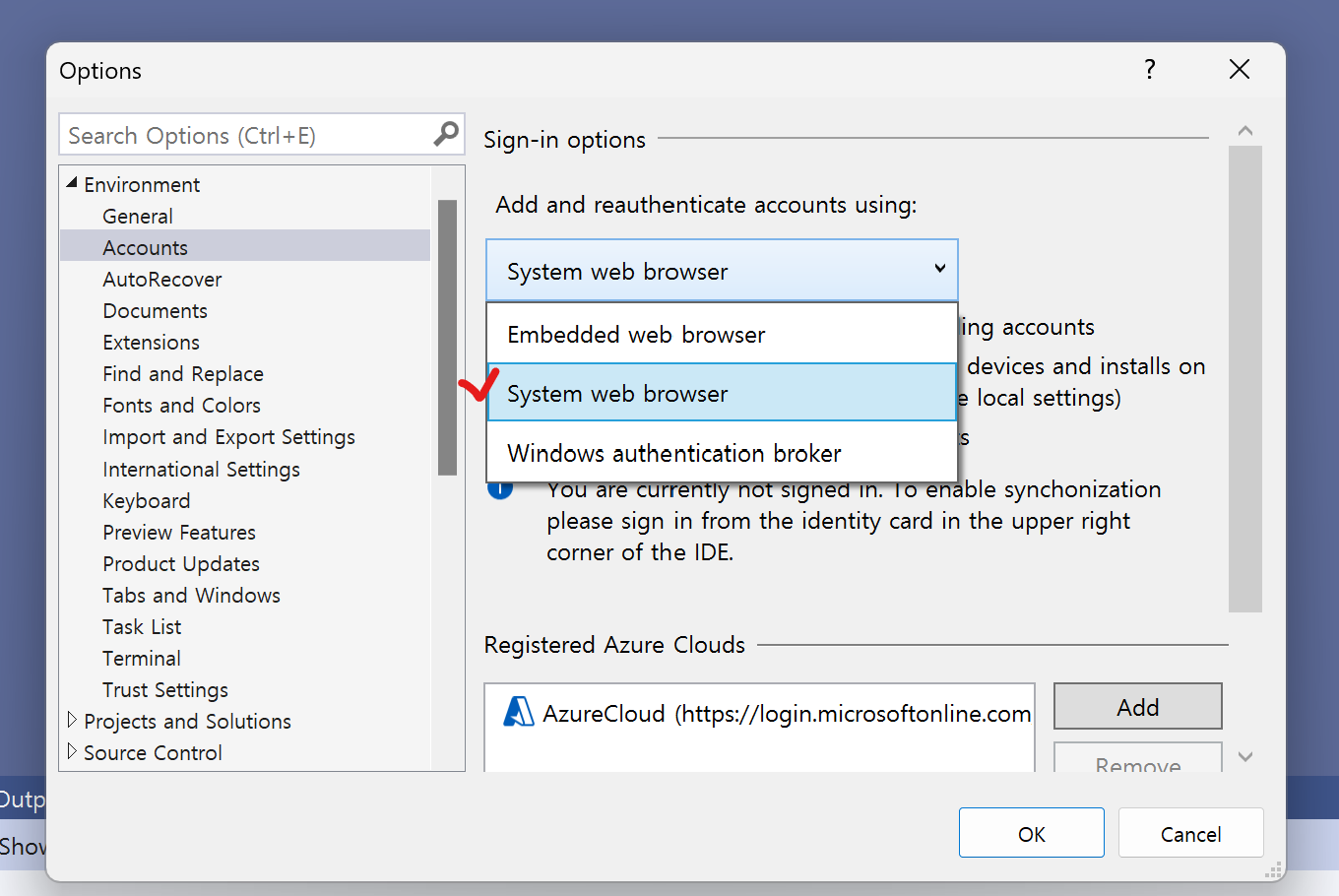 - Visual Studio 메뉴 -> Tools -> Options.. 클릭하여 보이는 아래 화면에서 System web browser 선택한다.